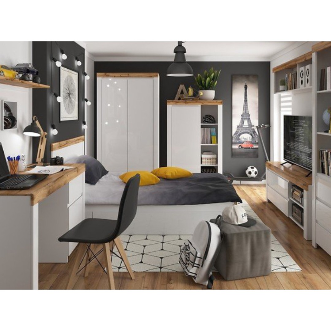 Doporučujeme kombinovat s ostatním nábytkem ze systému Holten. Nábytek této kolekce je vhodný pro vybavení moderního domova. Kombinace barev bílá/dub wotan/bílý lesk bude působit v pokoji designovým dojmem.