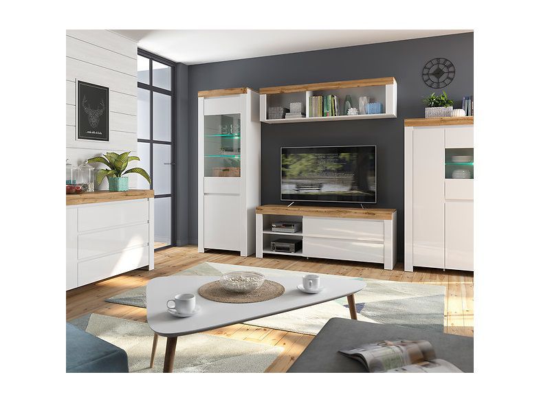 Kolekce Holten se skládá z komod, polic, vitrín, televizních stolků, skříně, regálu a závěsné skříňky. V modulu také najdete LED osvětlení. Použijte jednotlivé prvky kolekce Holten a vytvořte nádherné uspořádání obývacího pokoje.