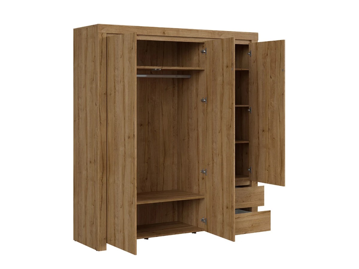 Barevné provedení skříně HOLTEN je v tónu dub waterford. Zhotovena je z kvalitního lamina. Šířka skříně s prostorem s šatní tyčí je 114 cm, policová část má šíři 60 cm. Vnitřní rozměr šuplíků je š. 50 x v. 9 x hl. 50 cm.