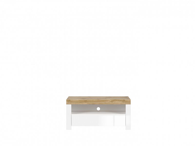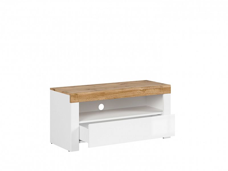 Televizní stolek HOLTEN RTV1S má moc krásný elegantní design a vyrábí se v barevné kombinaci dub wotan a bílý lesk. Celá kolekce se specializuje na bezúchytkové otevírání dveří a šuplíků s tichým dojezdem.