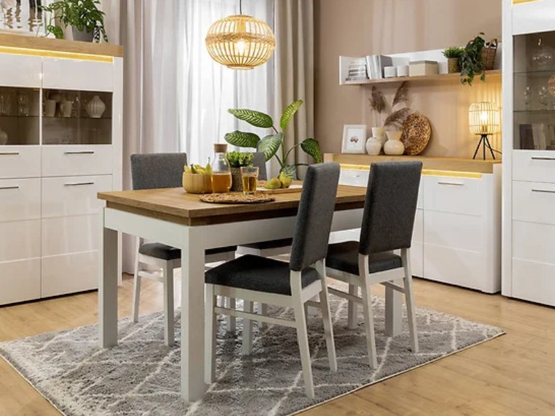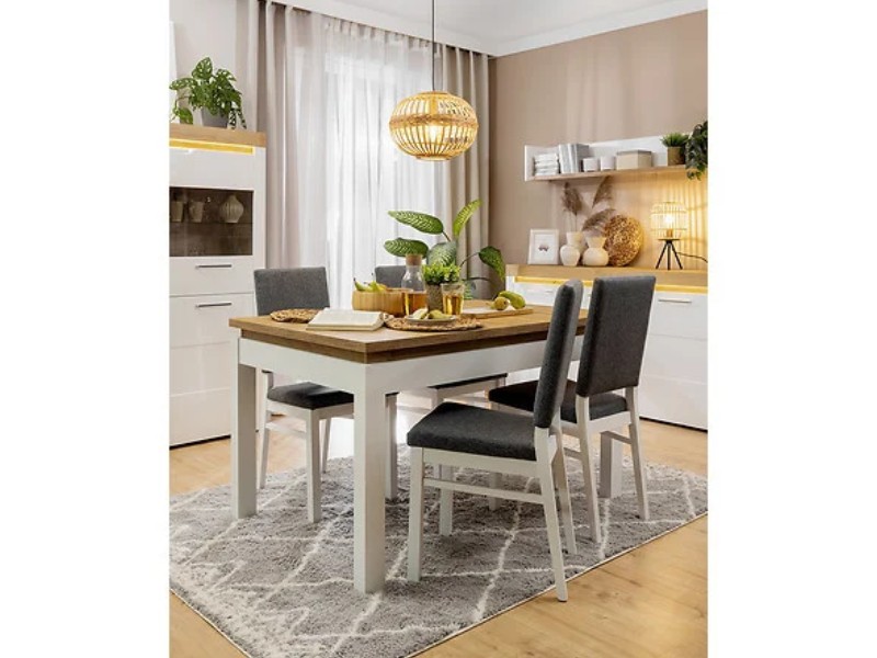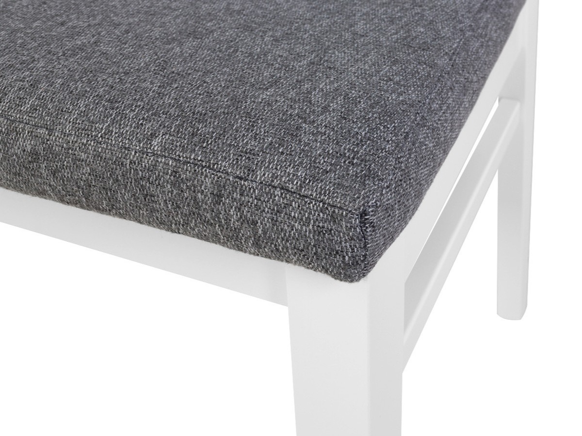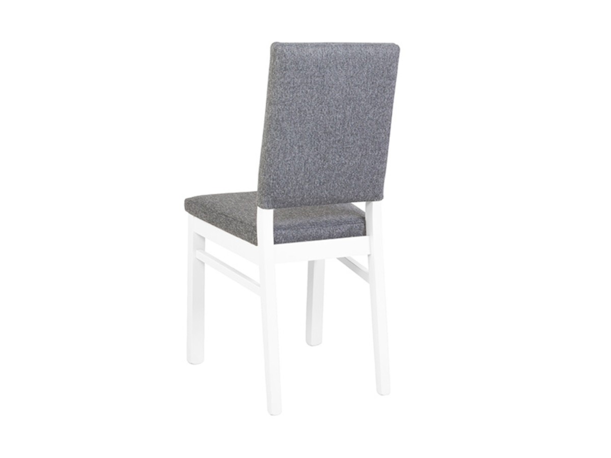 Konstrukce židle je vyrobena z bukového dřeva natřeného na bílou barvu. Vyznačuje se vysokou odolností a stabilitou. Sedák a opěrák jsou čalouněny látkou Raquel 16 black. Vyplněn měkkou pěnou.
