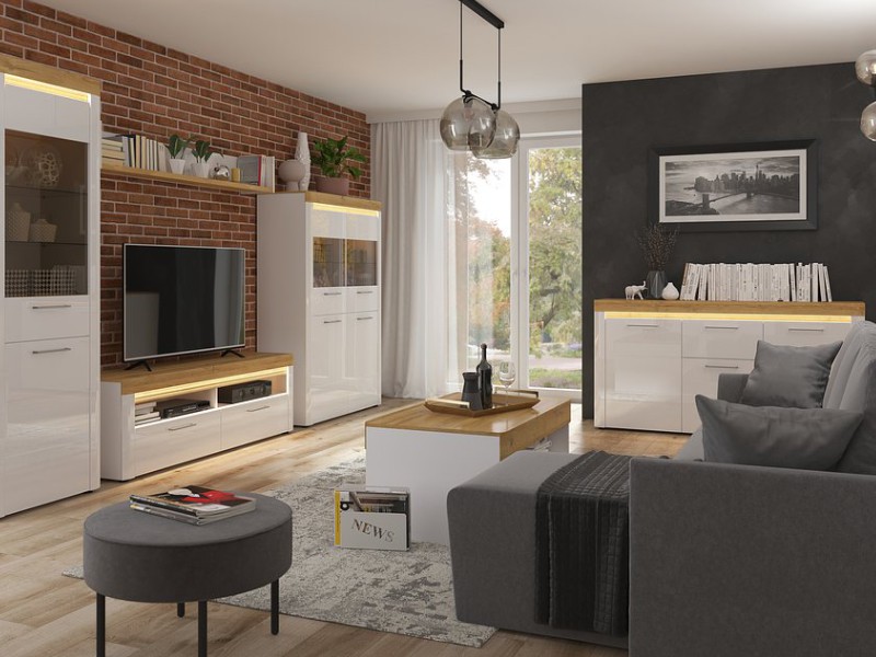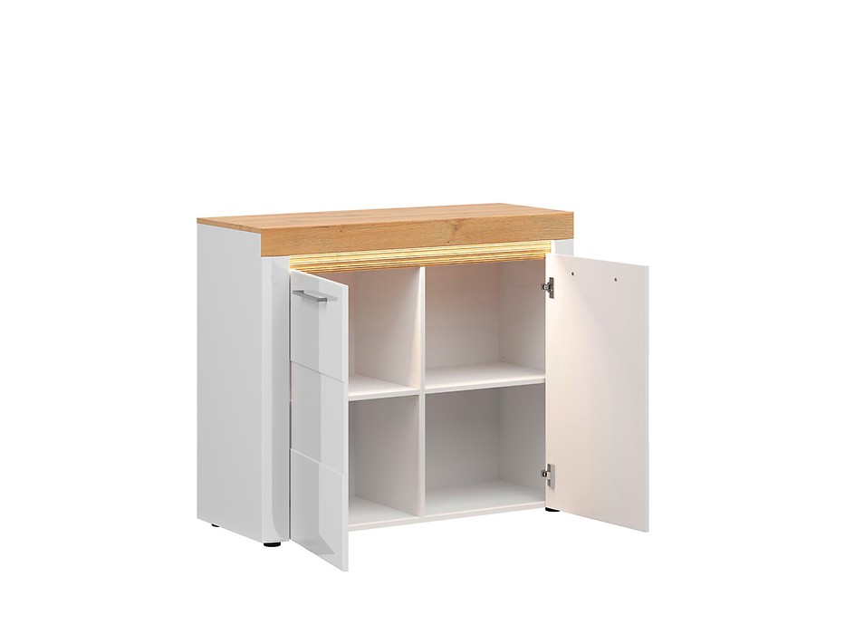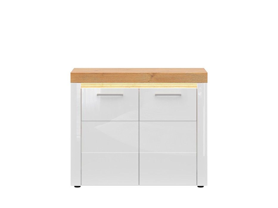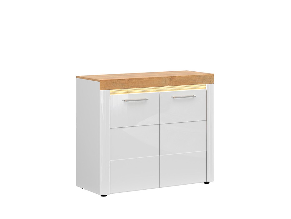 Komoda HORTON je vyrobená ve světlých tónech bílý lesk/dub zlatý grandson. Díky malým rozměrům se komoda snadno zakomponuje i do menších místností.
