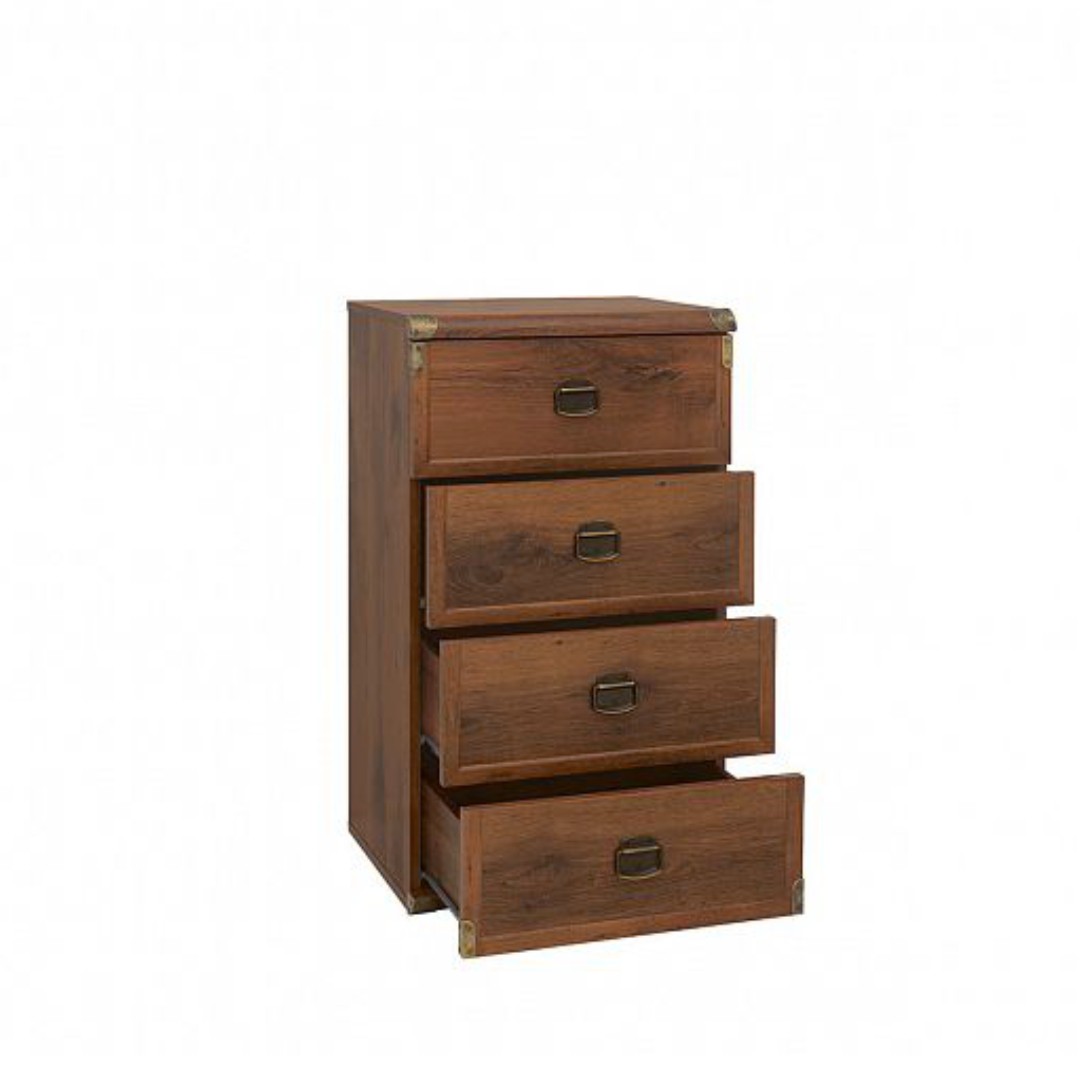 Úložný prostor komody INDIANA II NEW je v podobě 4 zásuvek na válečkových kolejničkách. Je vyrobena z lamina v barvě dub sutter. Kovové úchytky.