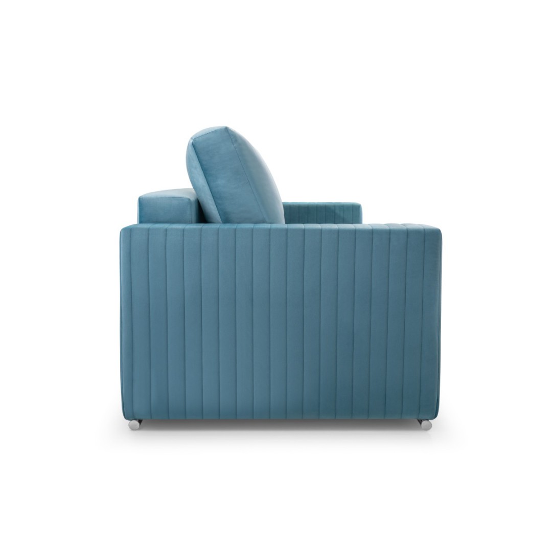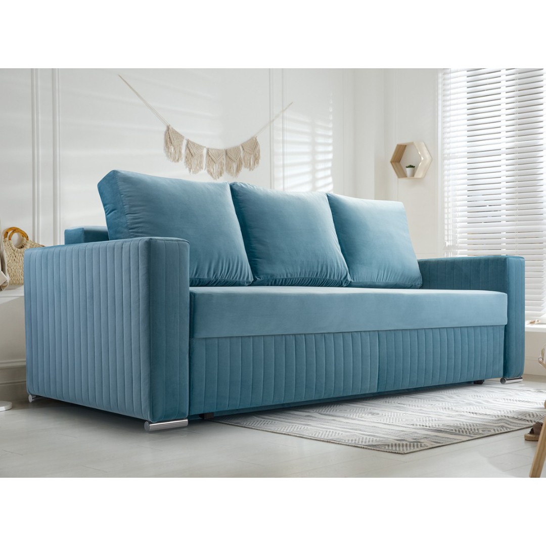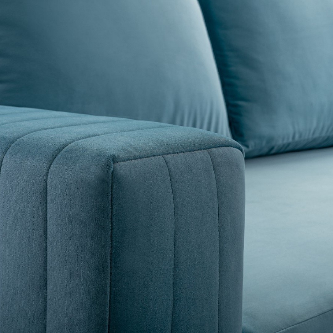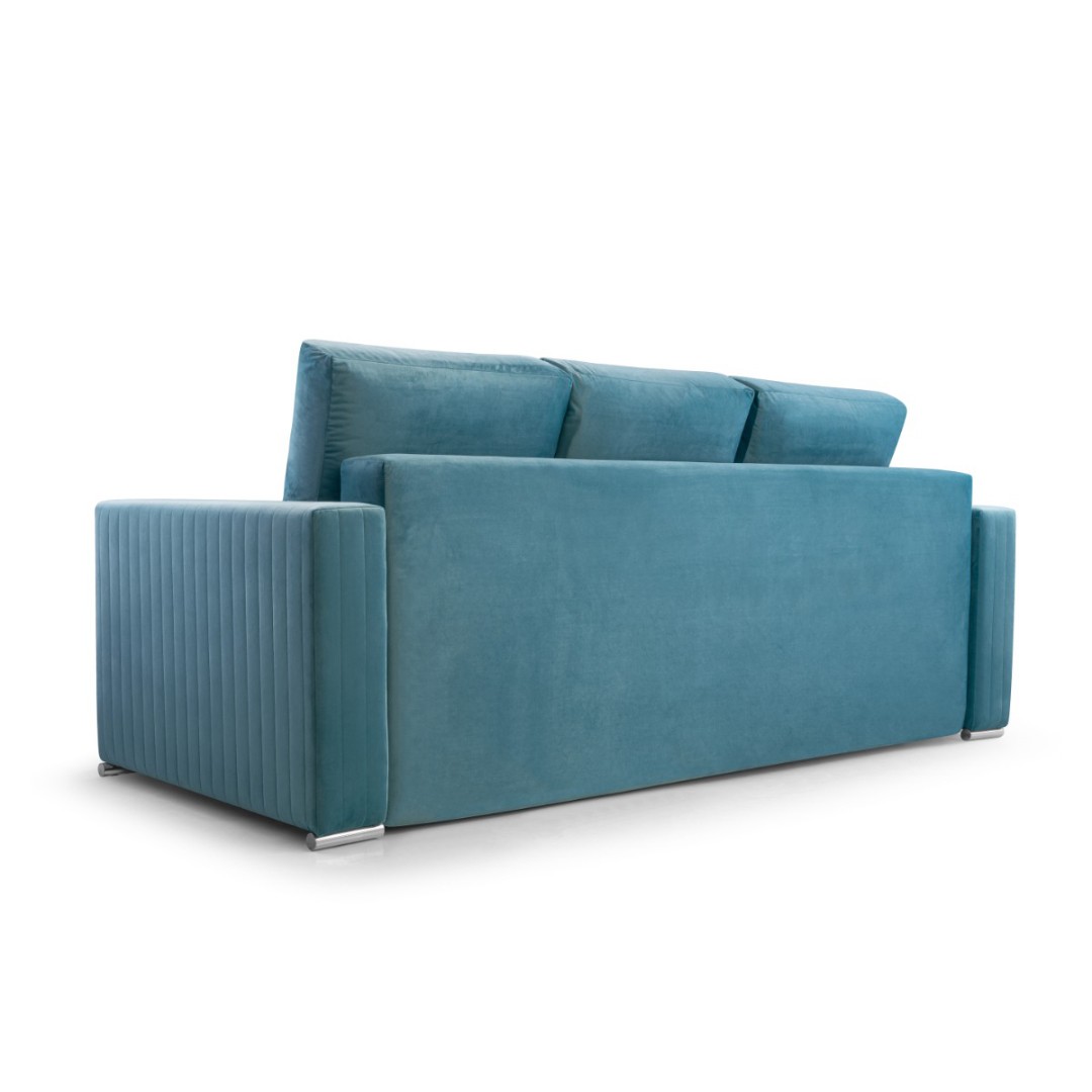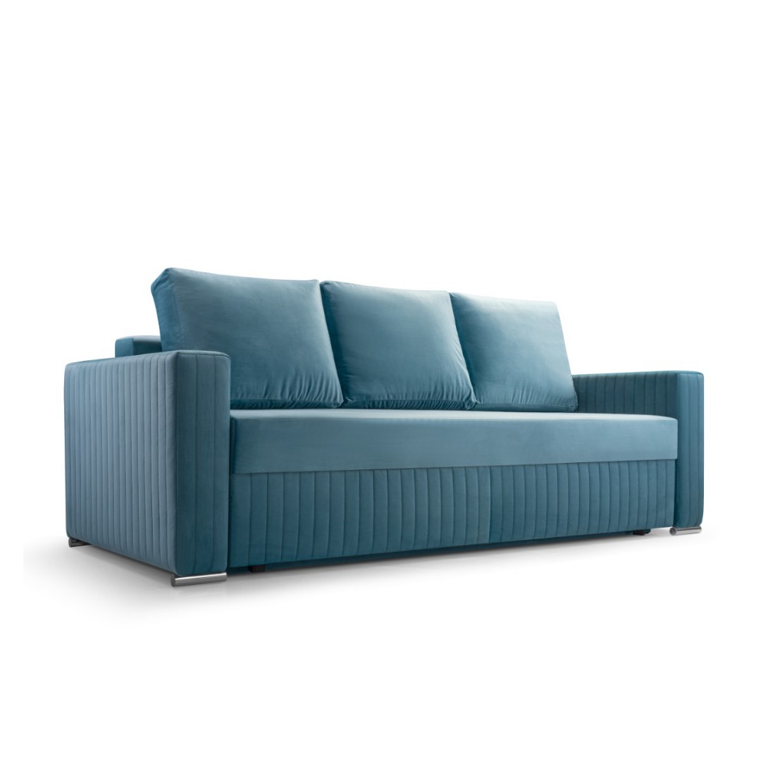 Látka světle modrá MAGIC VELVET 2260 - sametově hebká struktura, jemně lesklý povrch, snadná údržba. Ozdobné řasení na područkách + korpusu. Čalouněna jsou také záda pohovky v totožné barvě, jako i čelní část, proto je vhodná k umístění do prostoru.