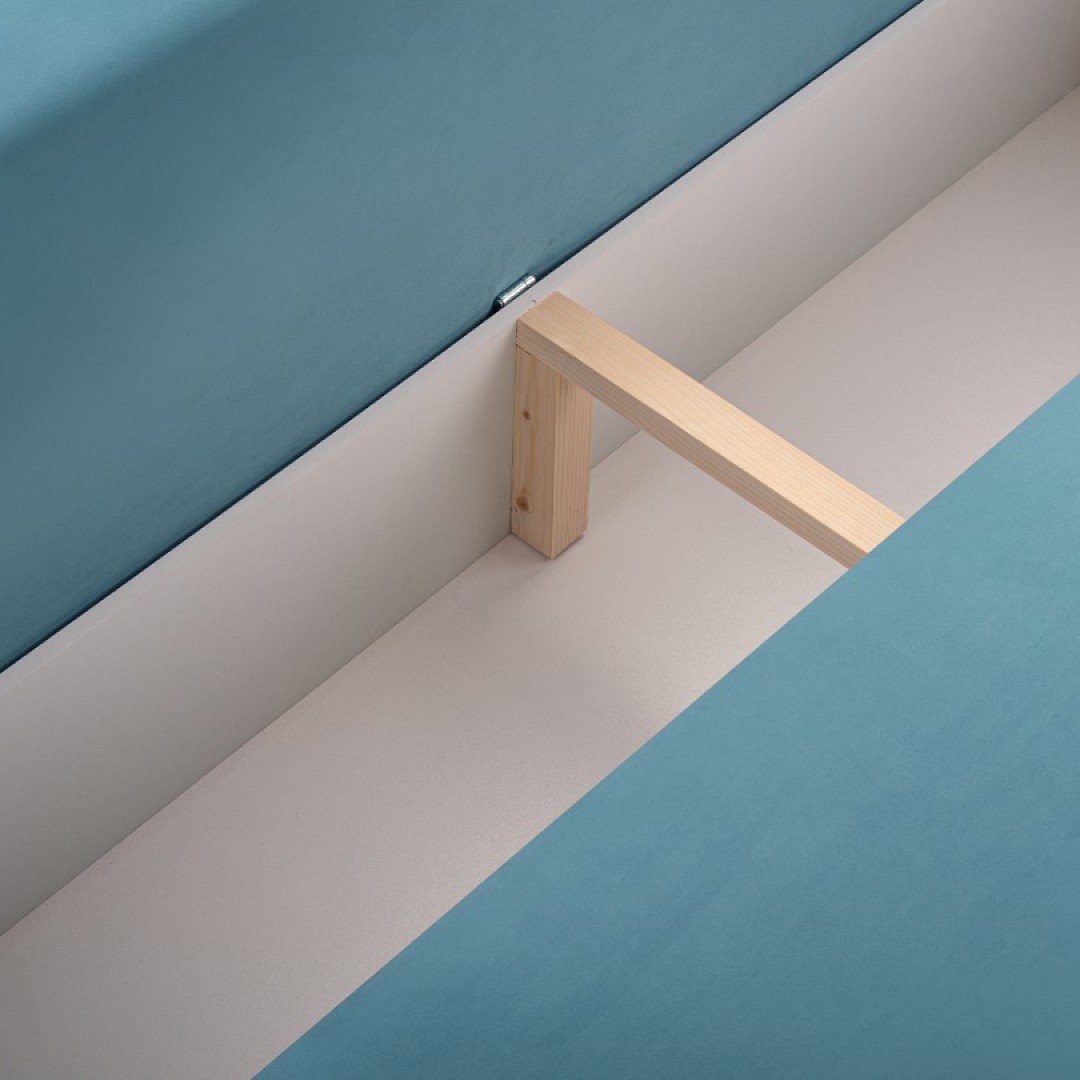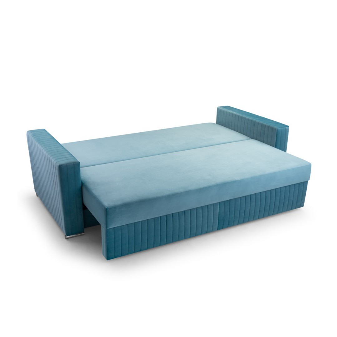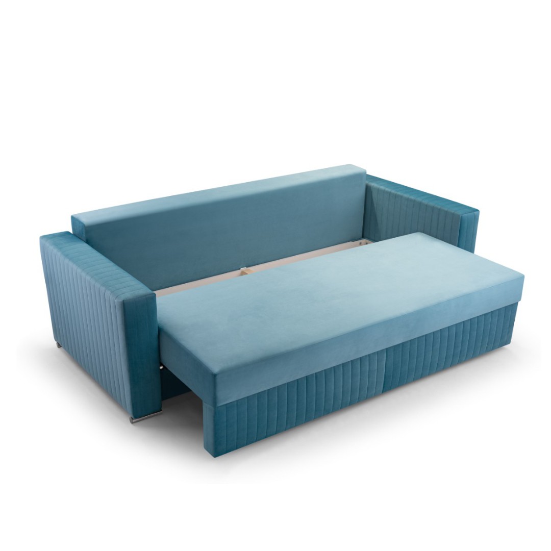 Rozložení pohovky je bezproblémové a komfortní díky typu Delfin. Velikost spací plochy po rozložení je 153 x 189 cm. Úložný prostor je vhodný pro uschování lůžkovin a denních dek.