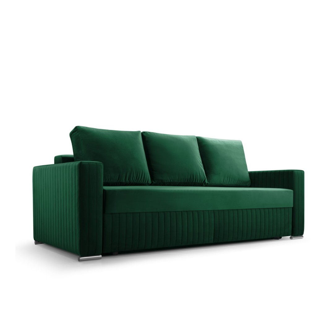 Látka tmavě zelená MAGIC VELVET 2225 - sametově hebká struktura, jemně lesklý povrch, snadná údržba. Ozdobné řasení na područkách + korpusu. Čalouněna jsou také záda pohovky v totožné barvě, jako i čelní část, proto je vhodná k umístění do prostoru.