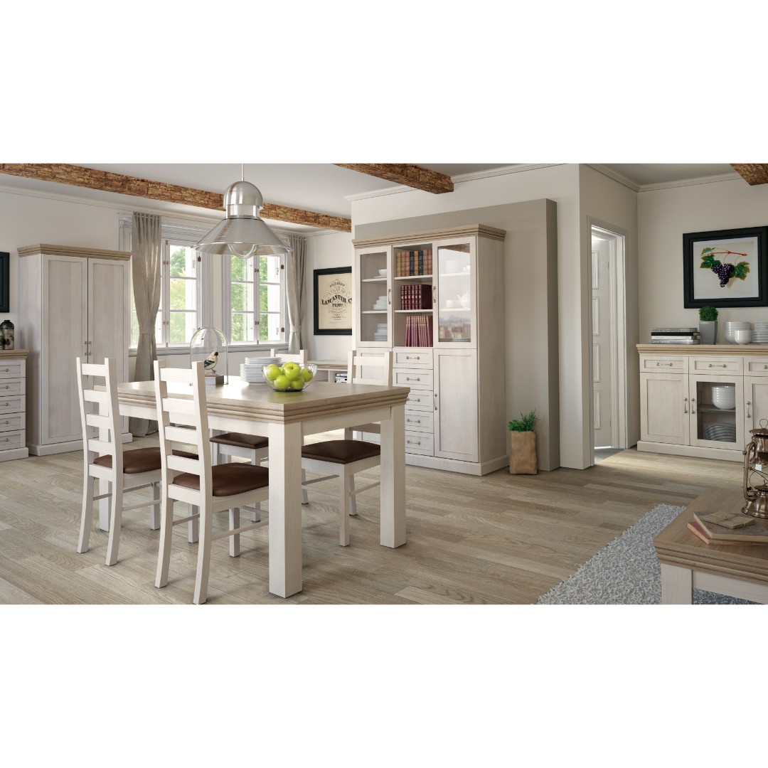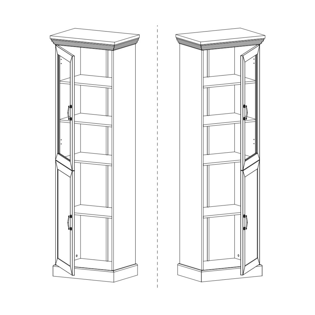 Světlé barevné provedení vitríny borovice bílá nordik/dub wild (vrch) krásně prosvětlí interiér a snadno se sladí s ostatním vybavením ve venkovském či klasickém stylu. Jemné detaily a tradiční design dodají místnosti osobitý šarm, který zaujme na první pohled.
