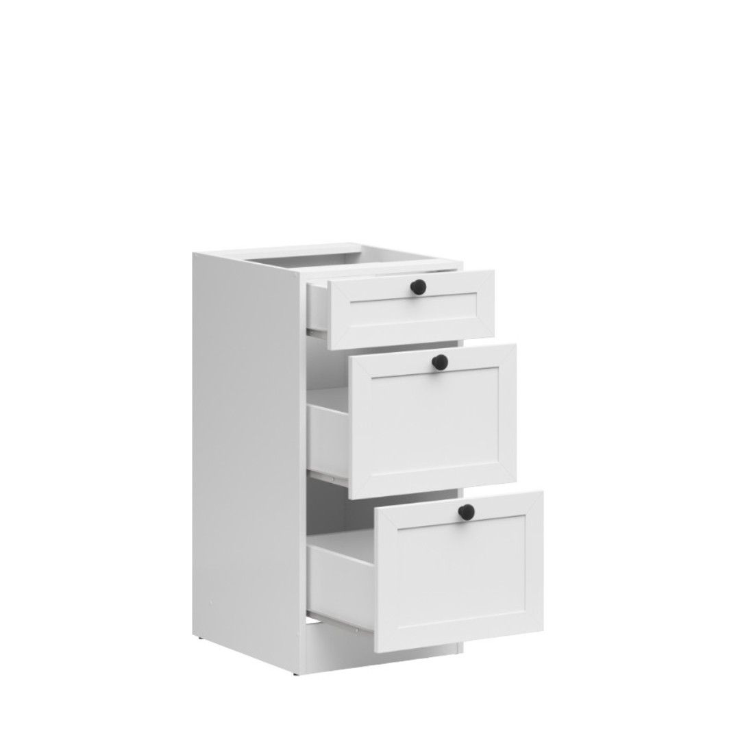 Tři šuplíky této skřínky jsou prakticky uspořádané. Dva z nich jsou hluboké a poskytují dostatek prostoru pro uložení hrnců, zatímco jeden menší šuplík je ideální pro příbory a drobné potřeby. Síla materiálu 1.6 cm, bočnice šuplíků 1.5 cm.