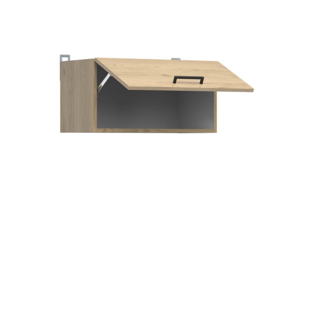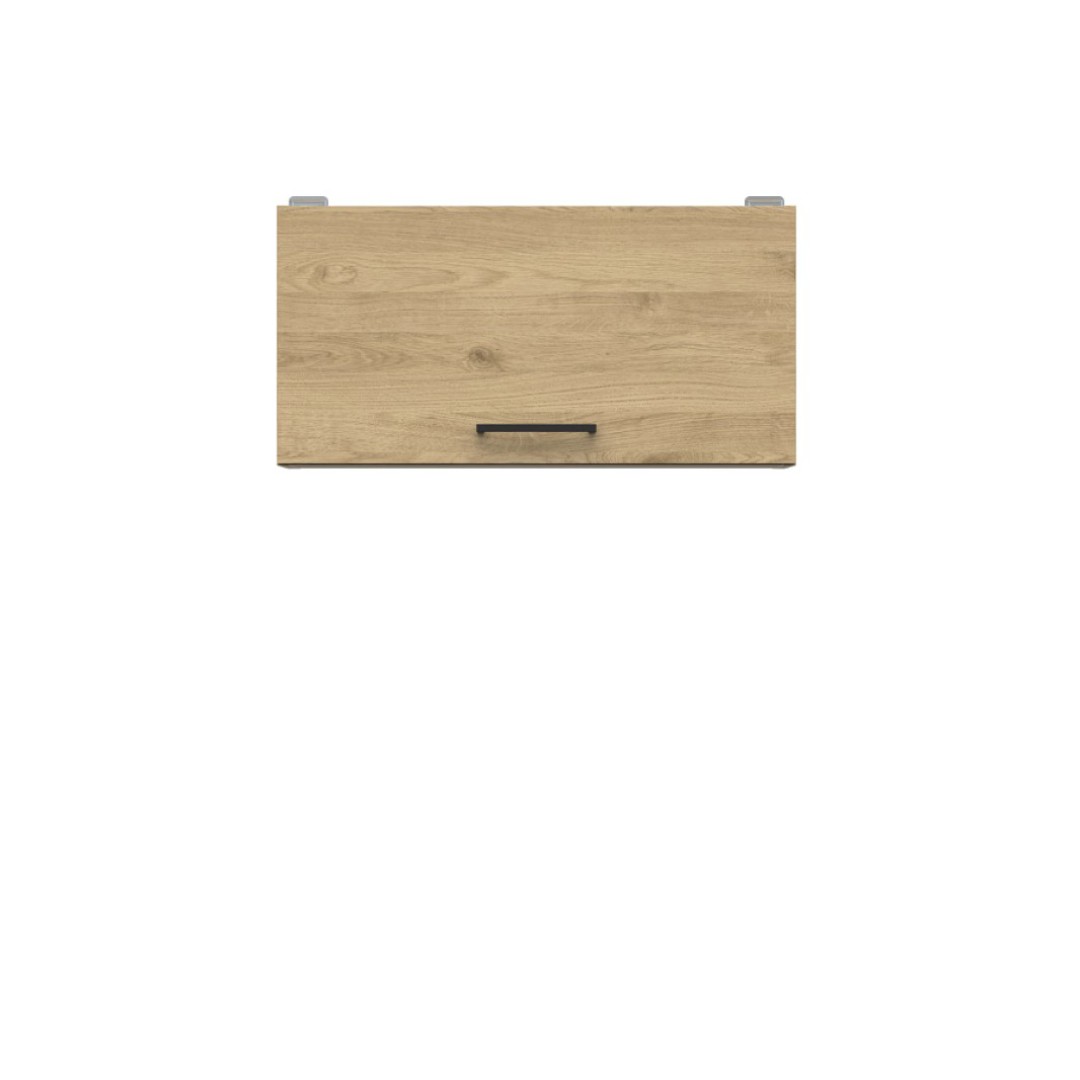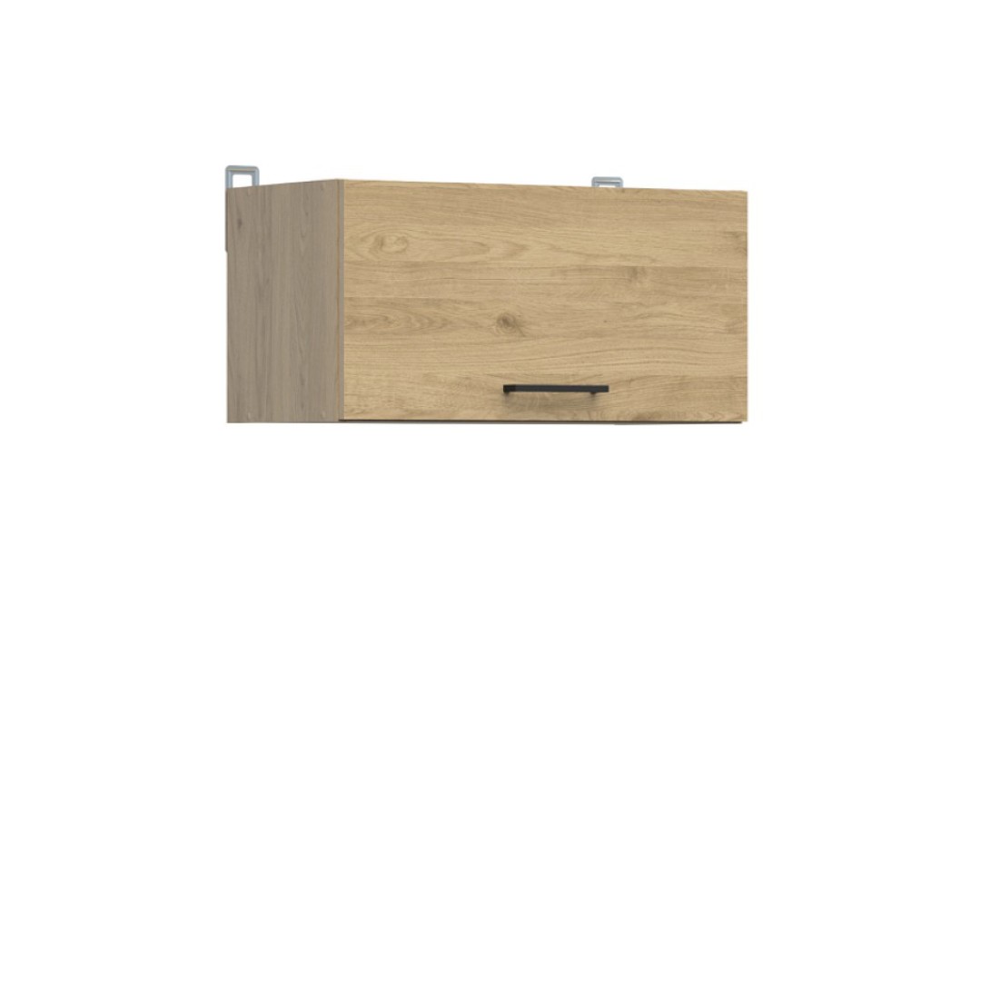 Dvířka se otevírání nahoru, za nimiž není žádná police. Vyrobeno z lamina v tónu dub bernstein.