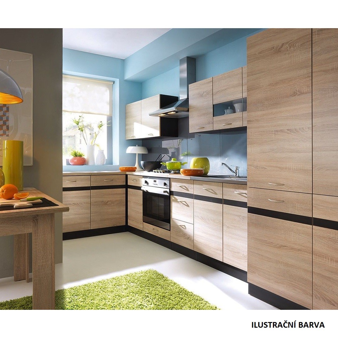 Rozměry samotné skříňky: š. 78.5 x v. 82 x hl. 45 cm. Barevné provedení dub bernstein, lišta dub černý.