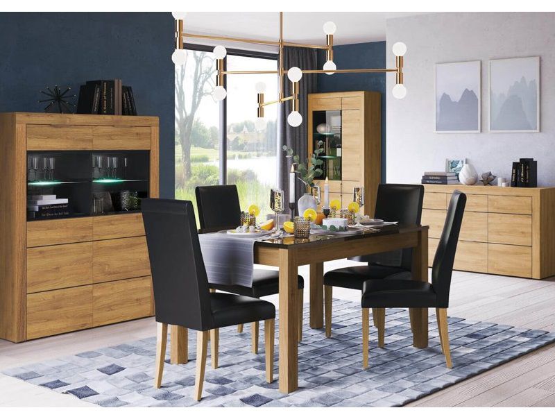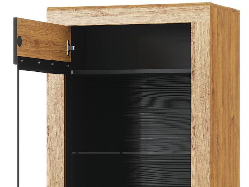 Vitrína Kamalli 10 má jedny dvířka, které jsou částečně prosklené, díky tomu můžete vystavit všem na obdiv své dekorační předměty, nebo trofeje. Lamino v barevném provedení dub camargue/černá mat se bude snadno udržovat.