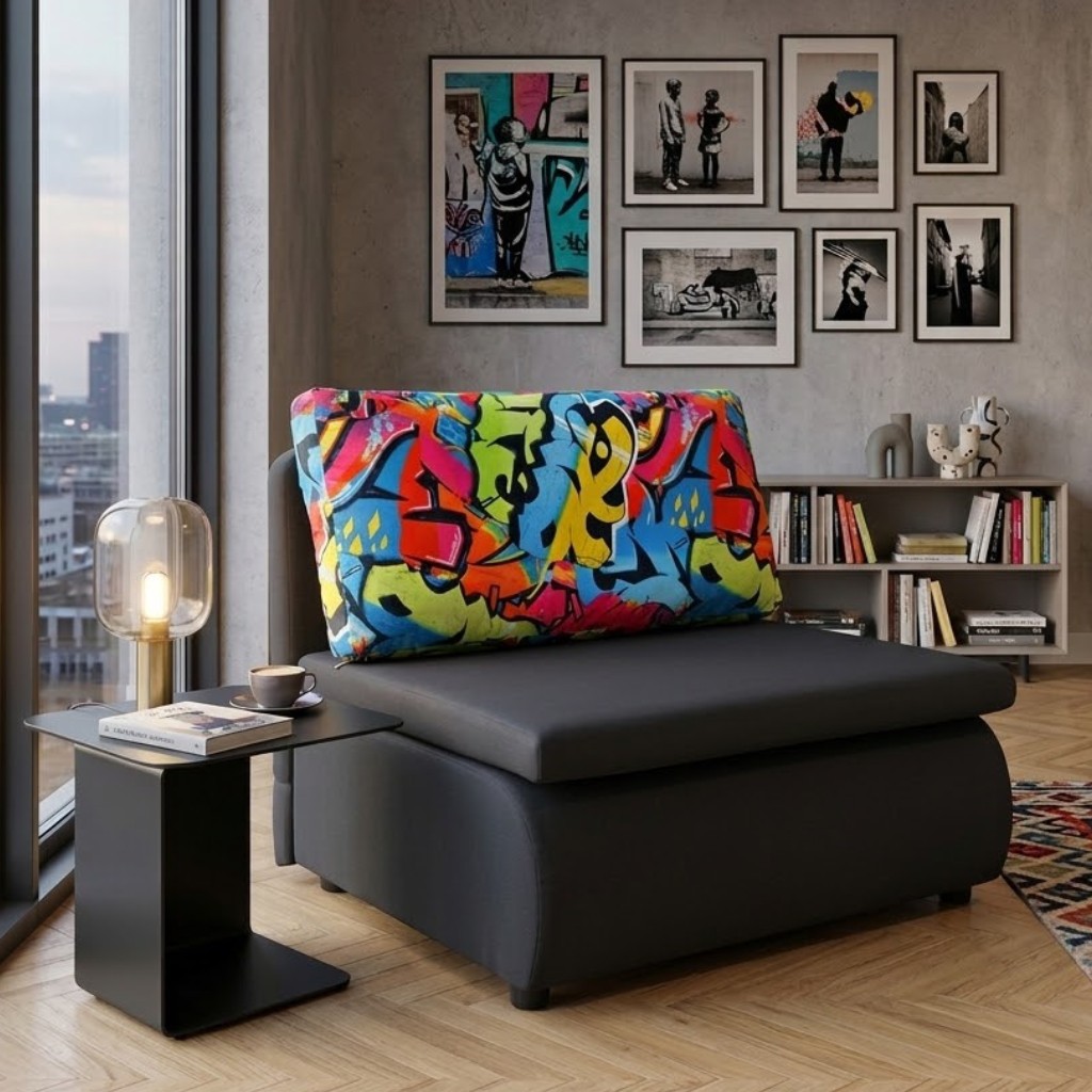 Pohovka Kamil - Graffiti kombinuje stylový design s praktickými funkcemi, což ji činí ideální volbou pro teenagery, kteří hledají pohodlný a moderní nábytek do svého pokoje. S možností rozkladu na lůžko a dostatkem úložného prostoru nabízí tato pohovka dokonalé řešení pro malé prostory.