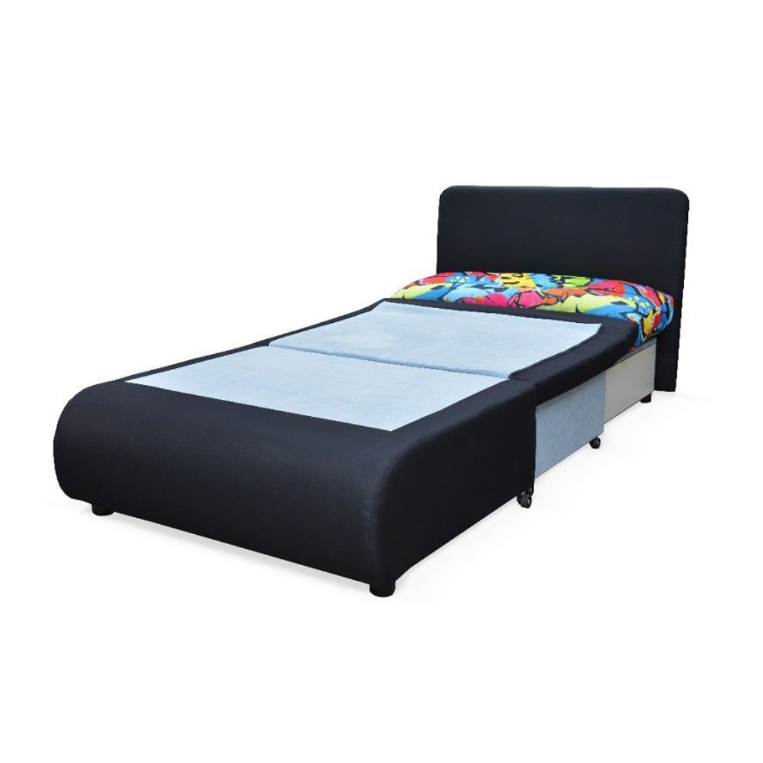 Pohovka Kamil je potažena látkou v kombinaci Sawana 14 černá/Grafiti 2. Je rozkládací na lůžko. Po rozložení vznikne spací plocha o velikosti 100 x 190 cm. Součástí je i úložný prostor. Rozměry úložného prostoru: 83 x 51 cm. Rozklad oceníte zejména v malých pokojících, kde není místa nazbyt.
