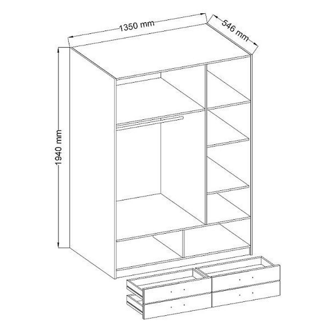 Úložný prostor je v podobě polic, šatní tyče a zásuvek ve spodní části, které jsou vhodné pro uschování drobností, ve kterých toužíte mít přehled. Šuplíky jsou opatřeny pojezdy (hliníkové) s kolečky zaručující hladký chod. Dvířka mají k dispozici praktické úchyty z plastu pro snadnější manipulaci při jejich otevírání.