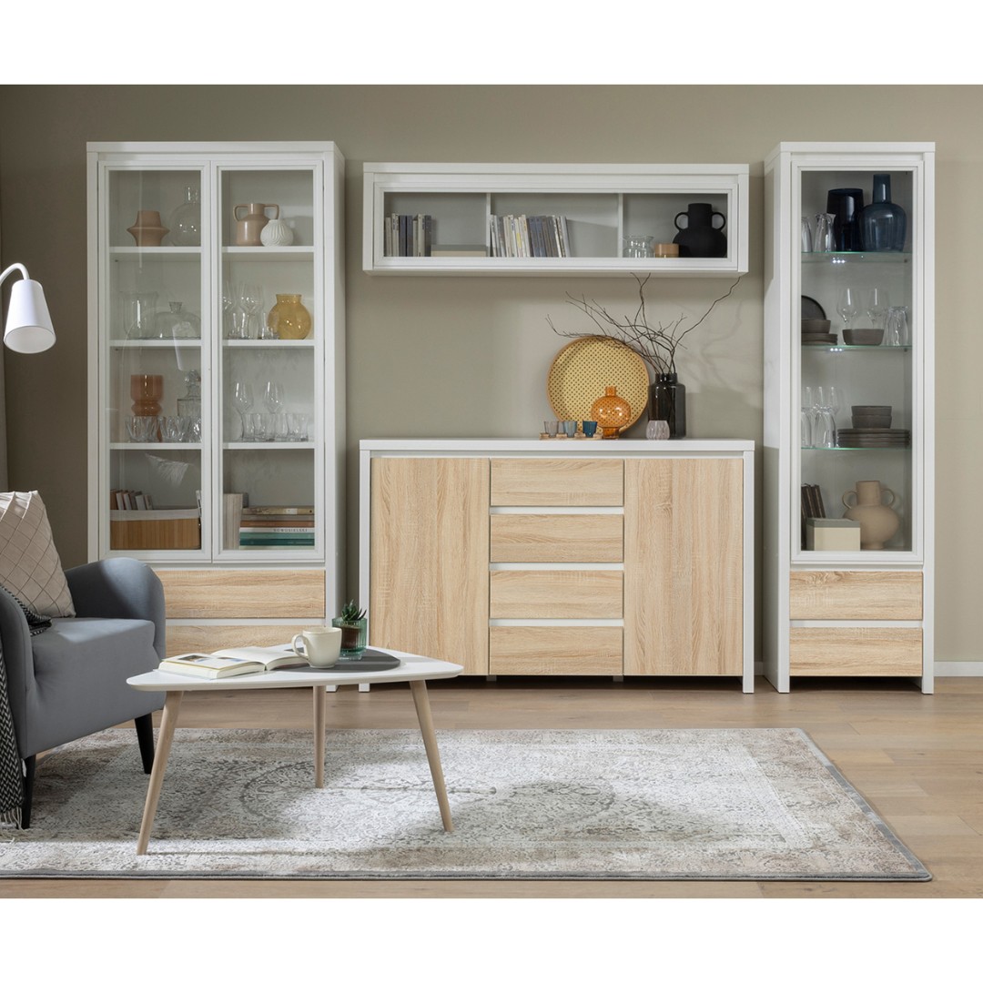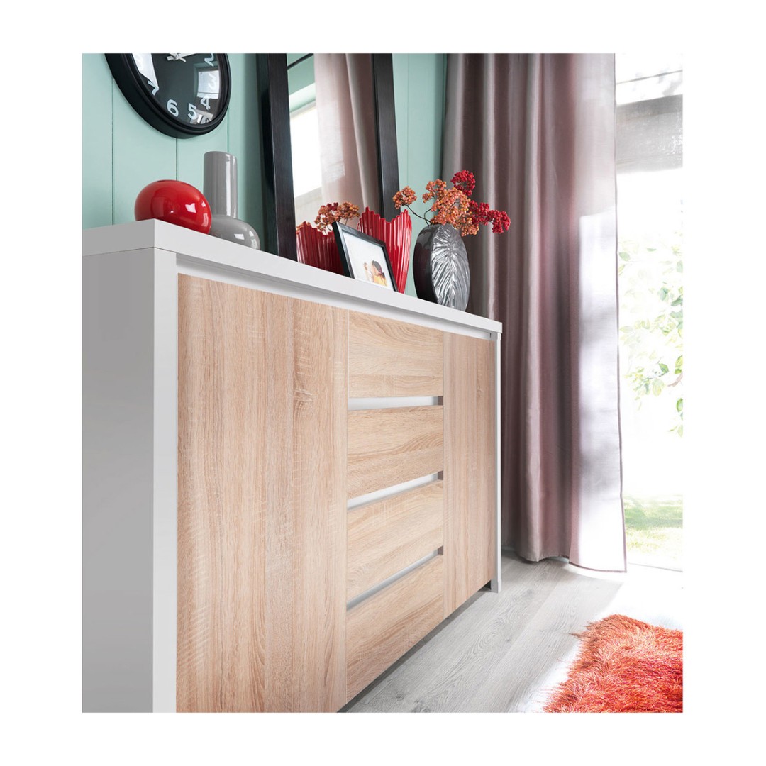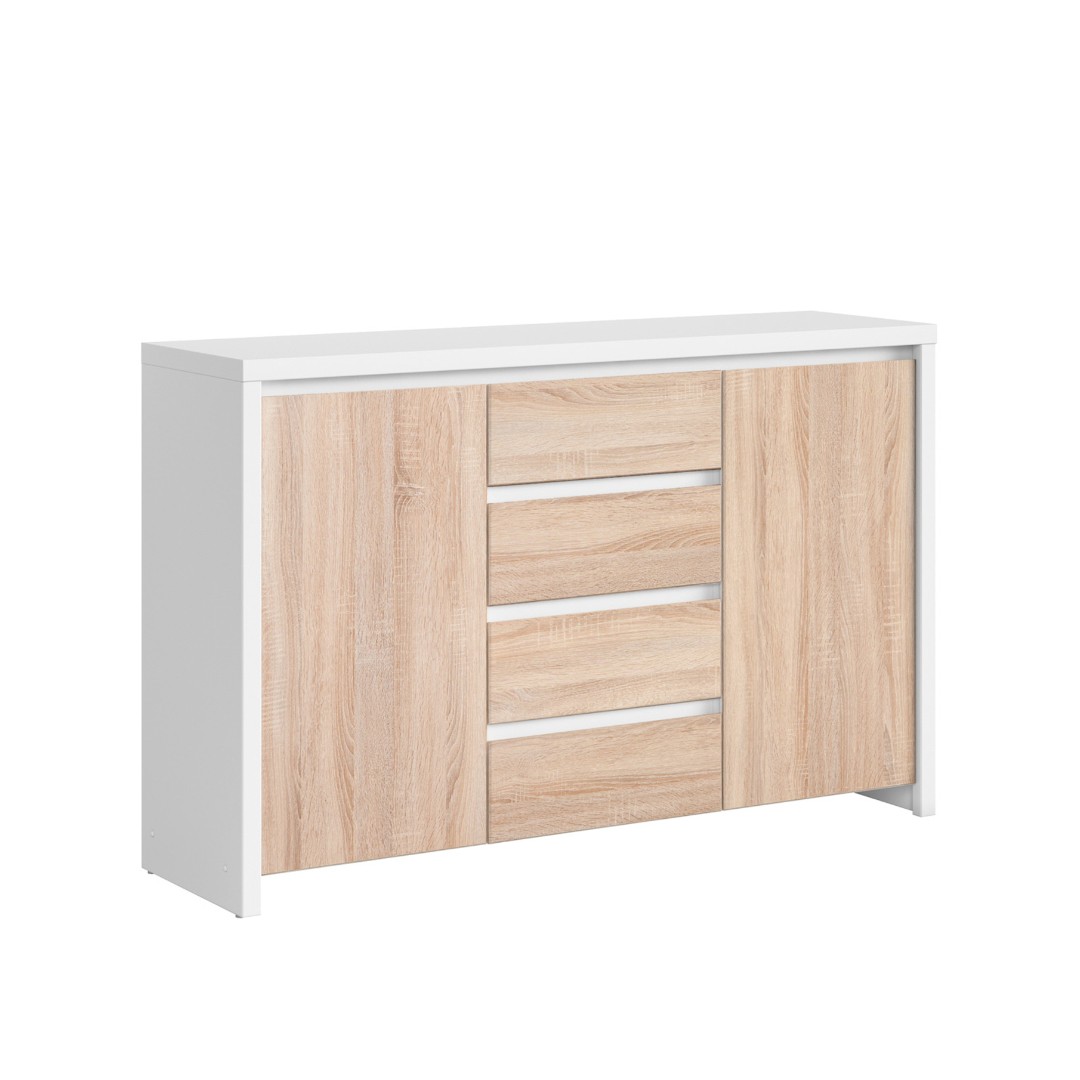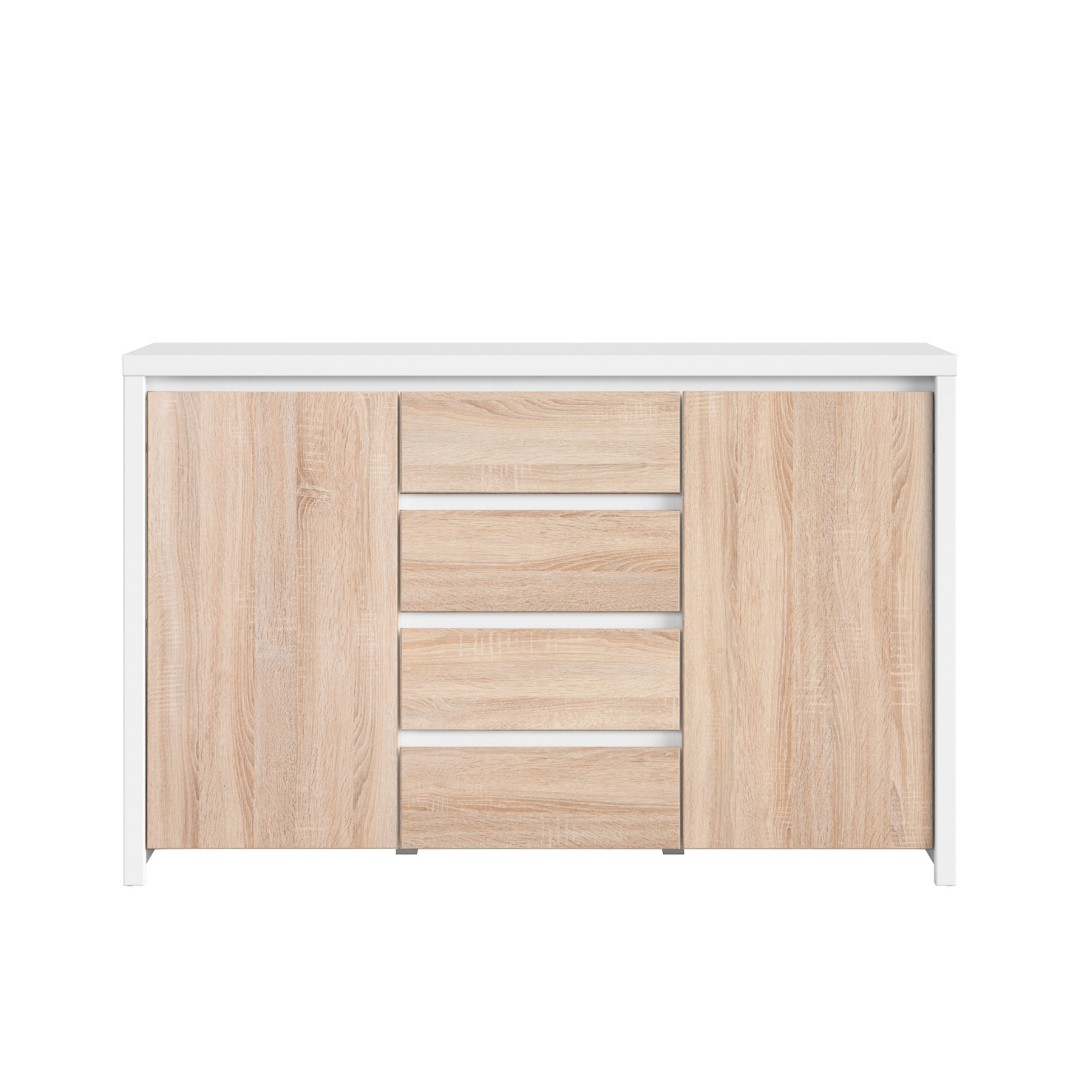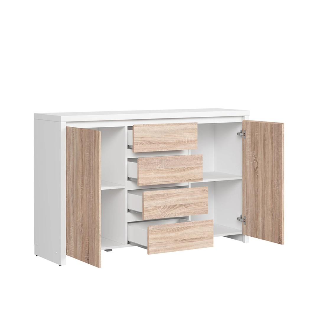 Komoda/příborník ze systému Kaspian KOM2D4S v barevném provedení bílá/dub Sonoma je praktická komoda se 4 zásuvkami a 2 skříňkami s vnitřními prostory oddělenými poličkou, takže poskytuje dostatek úložného prostoru a usnadní tak udržení pořádku. Tvarovaná přední hrana dvířek a čelních zásuvek umožňuje bezúchytkové otvírání...
