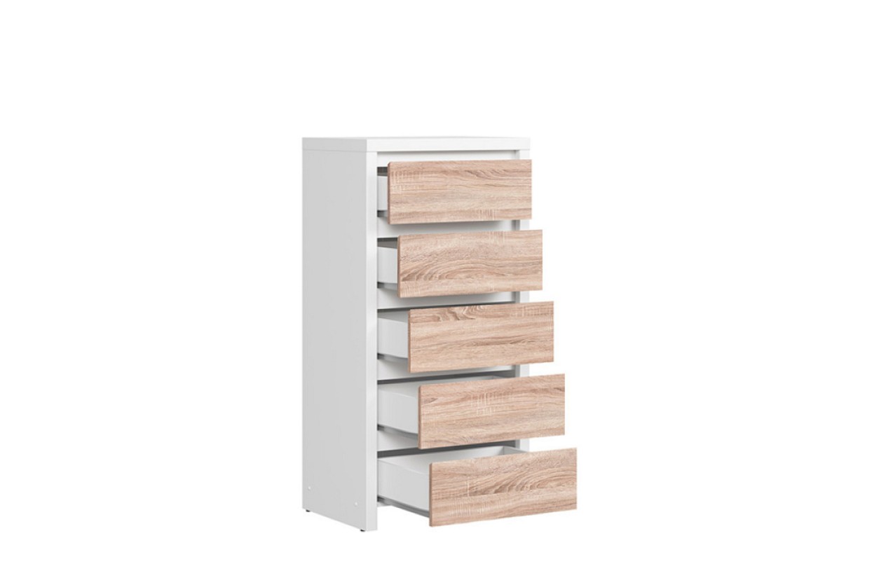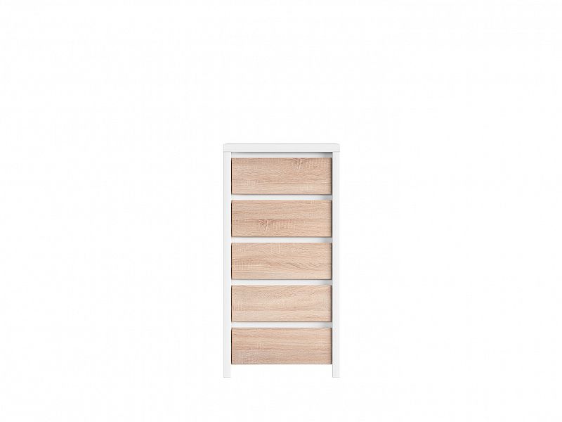 Úzká komoda ze systému Kaspian KOM5S v barvě bílá/dub Sonoma. Komoda má 5 lehce výsuvných zásuvek, do kterých se vejde spousta domácích potřeb. Vnitřní rozměr šuplíků je š. 43 x v. 11 x hl. 35 cm...