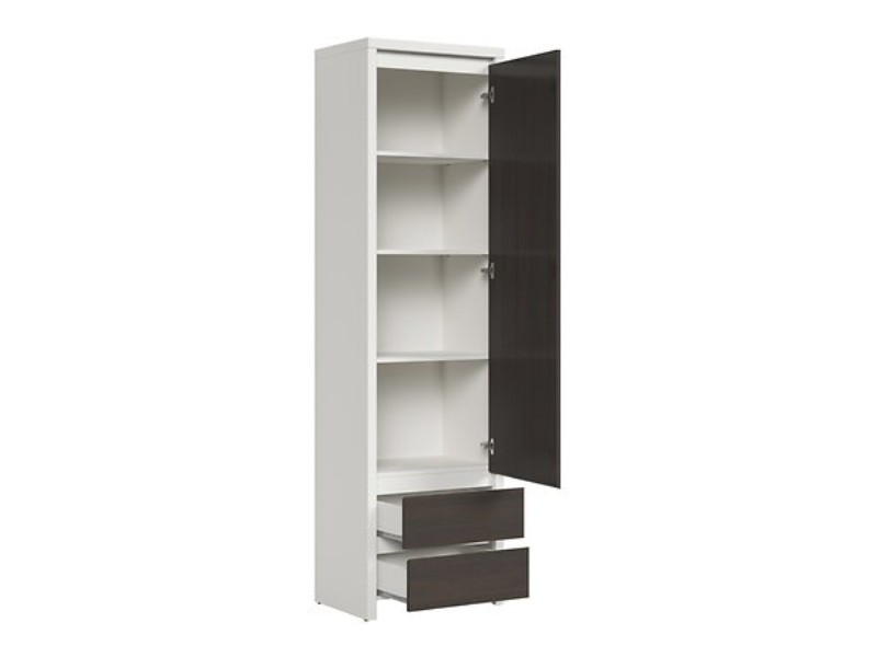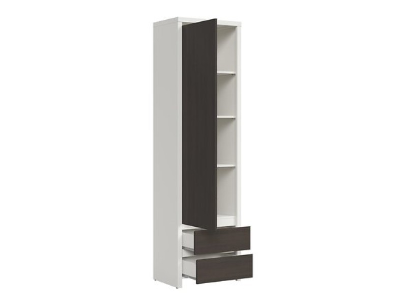 Hlavní předností regálu je možnost umístění otevírání dvířek vlevo i vpravo. Materiál ze kterého je regál vyroben je lamino v barevné kombinaci bílá/wenge.