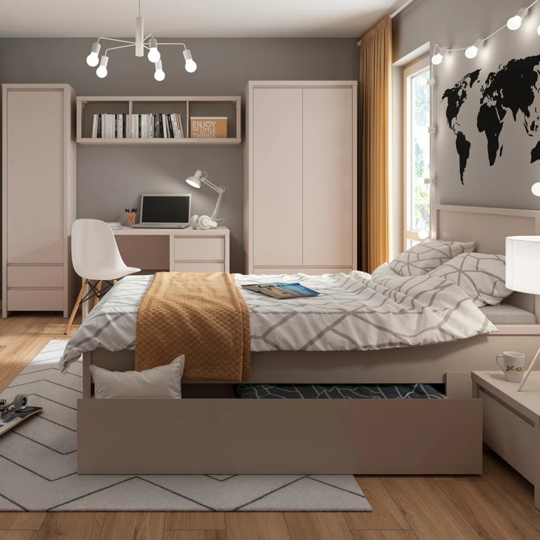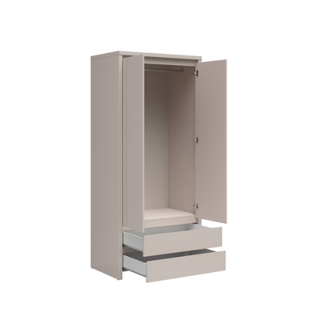 Dodejte své ložnici styl s dvoudveřovou skříní KASPIAN SZF2D2S z kolekce KASPIAN. Tento kousek v elegantní barvě kašmír vsází na funkčnost – prostorná část s šatní tyčí je připravena k zavěšení veškerých vašich oblíbených kousků oblečení od lehkých halenek až po zimní kabáty...