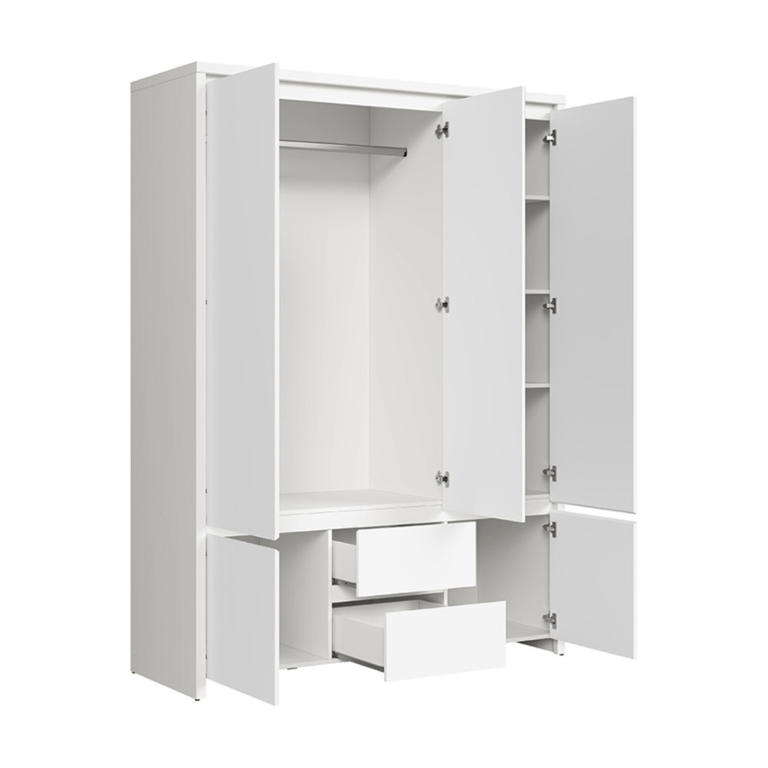 Šatní skříň se zrcadlem ze systému Kaspian (SZF5D2S) nabízíme také v kombinaci barev bílé a bílé matné. Levá dvoudvéřová část skříně obsahuje šatní tyč, pravá část skříně je tvořena třemi praktickými policemi. Ve spodní části se nacházejí dvě zásuvky a dvě praktické skříňky...