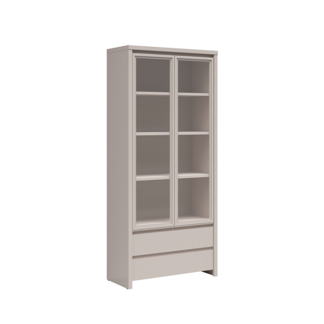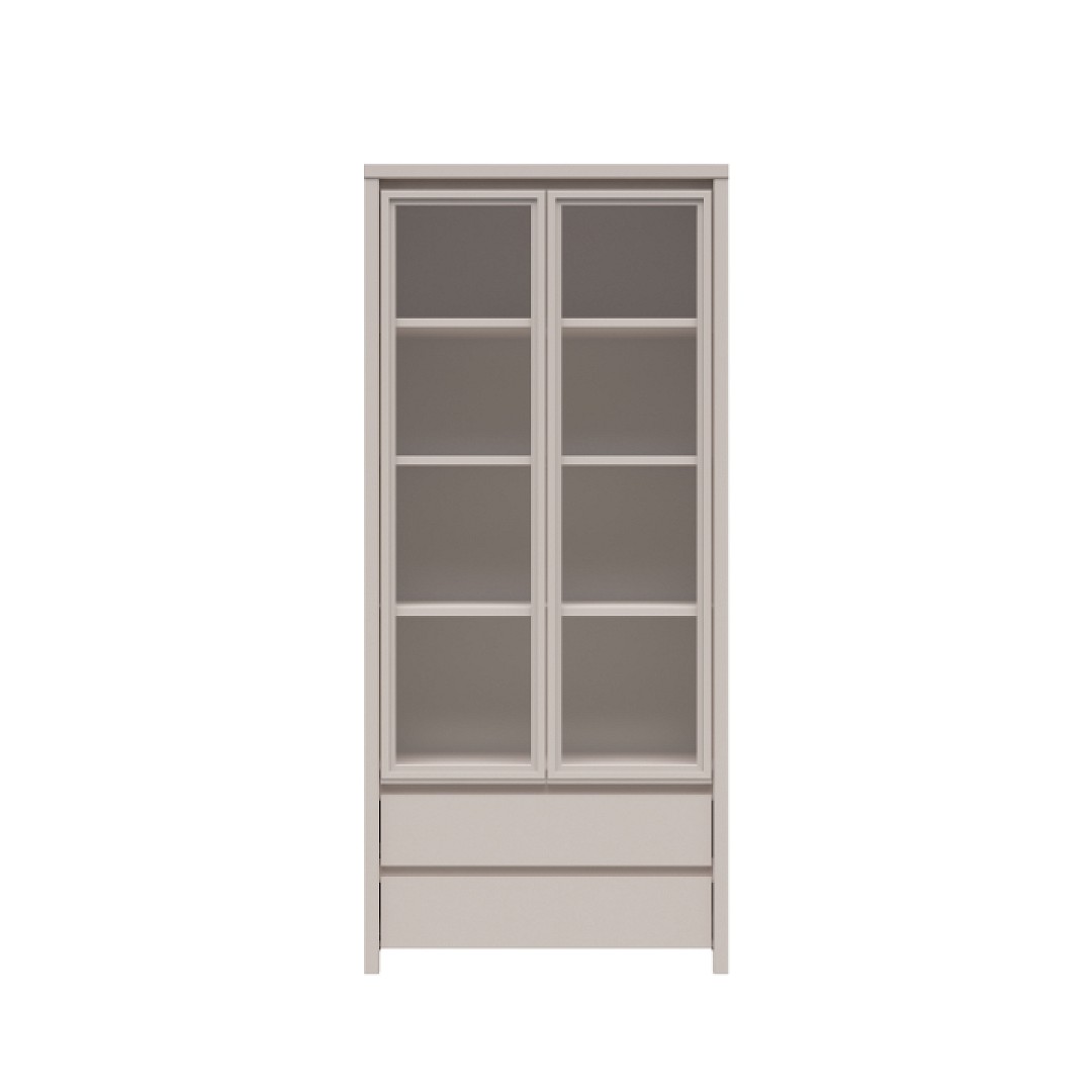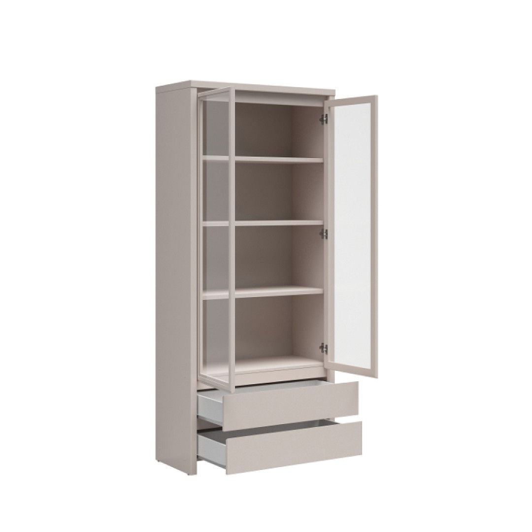 Dvířka jsou s tvrzeným sklem. Materiál korpusu je lamino, které se snadno udržuje. Barevné provedení vitríny Kaspian je v krásném dekoru kašmír. Úložný prostor vitríny je v podobě polic a dvou šuplíků ve spodní části. Vnitřní rozměry šuplíků jsou š. 77 x v. 11 x hl. 35 cm.