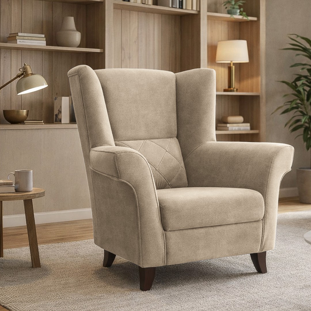 Barevné provedení je v béžové barvě látky Castel 15. V nabídce další barvy viz barevné varianty. Výška sedu je 43 cm. Šířka sedáku 52-47 cm - zužuje se. Tvarované opěradlo poskytuje oporu páteři a zlepšuje pohodlí při sezení. Dřevěné nohy v barvě ořechu zajímavého tvaru dozajista také zaujmou na první pohled. Dodávají křeslu moderní nádech a lehký designový vzhled.