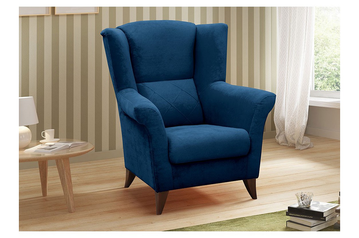 Křeslo je potaženo tmavě modrou látkou Kronos 09. Tato látka je typu pet friendly - snadné čištění od zvířecích chlupů. Cigaret test - odolná, nežmolkuje, vysoká otěruvzdornost. Trendy prošití opěráku.