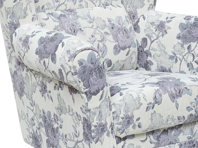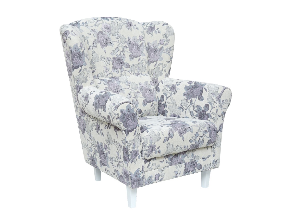 Křeslo KLIPOS má vyrobeny nožky z masivu v bílém provedení. Potaženo je stylovou látkou květy v béžovofialové barvě NA03 KVĚTY.