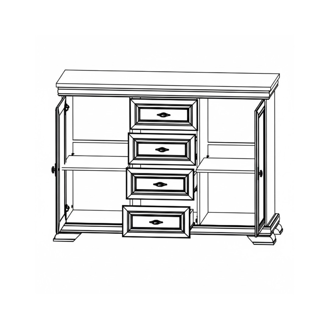 Komoda zaujme masivní horní deskou s dekorativním profilováním a elegantními vyřezávanými nožkami. Středovou část tvoří čtyři prostorné zásuvky ideální pro uložení drobností. Po stranách naleznete dvoje plná dvířka s vnitřními policemi, které poskytují dostatek místa pro větší předměty.