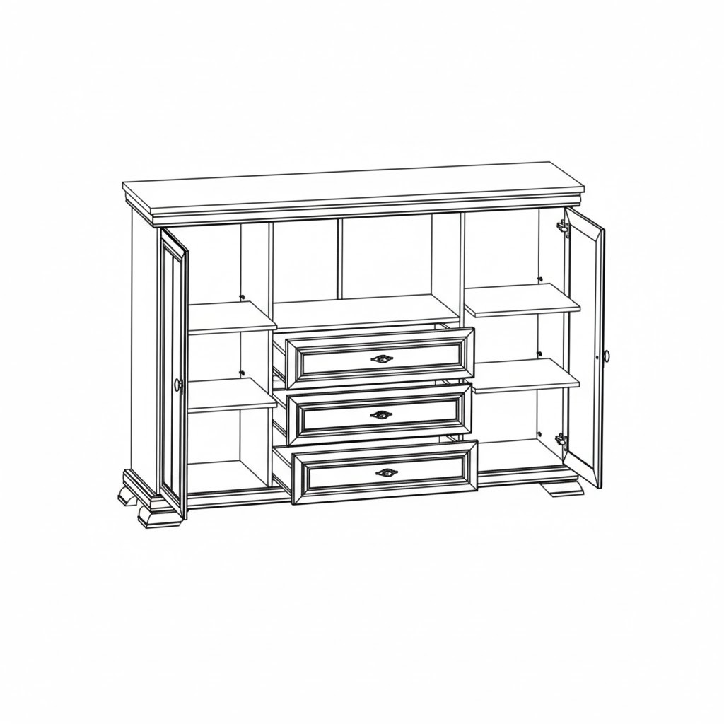 Skutečné tajemství tohoto kusu nábytku se však skrývá v jeho středové části. Zde se nachází diskrétní uzavřený prostor se sklápěcími dvířky, který slouží jako stylový domácí bar. Tento prvek umožňuje mít oblíbené nápoje a barmanské doplňky vždy po ruce, a přitom je uchovávat elegantně skryté před zraky hostů. Spodní část vitríny pak doplňují klasické zásuvky, které poskytují další úložný prostor pro vše, co vyžaduje bezpečné uložení. Celý koncept podtrhuje masivní podnož a patinované kovové úchytky zlaté barvy, díky čemuž se vitrína KOBE stane dominantou každého obývacího pokoje či jídelny, kde je kladen důraz na tradici a vytříbený vkus.