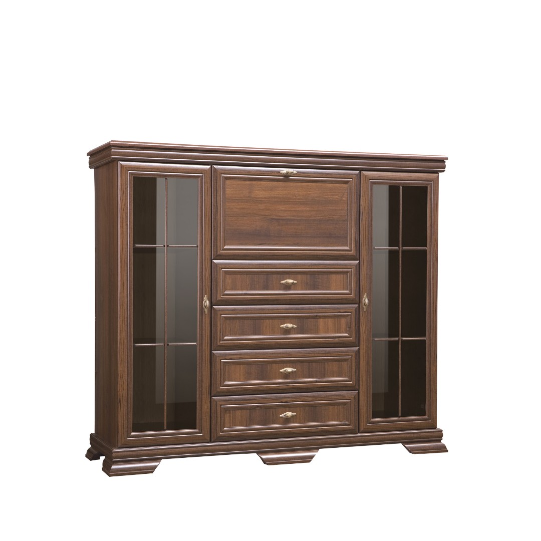 Skutečné tajemství tohoto kusu nábytku se však skrývá v jeho středové části. Zde se nachází diskrétní uzavřený prostor se sklápěcími dvířky, který slouží jako stylový domácí bar. Tento prvek umožňuje mít oblíbené nápoje a barmanské doplňky vždy po ruce, a přitom je uchovávat elegantně skryté před zraky hostů. Spodní část vitríny pak doplňují klasické zásuvky, které poskytují další úložný prostor pro vše, co vyžaduje bezpečné uložení. Celý koncept podtrhuje masivní podnož a patinované kovové úchytky zlaté barvy, díky čemuž se vitrína KOBE stane dominantou každého obývacího pokoje či jídelny, kde je kladen důraz na tradici a vytříbený vkus.