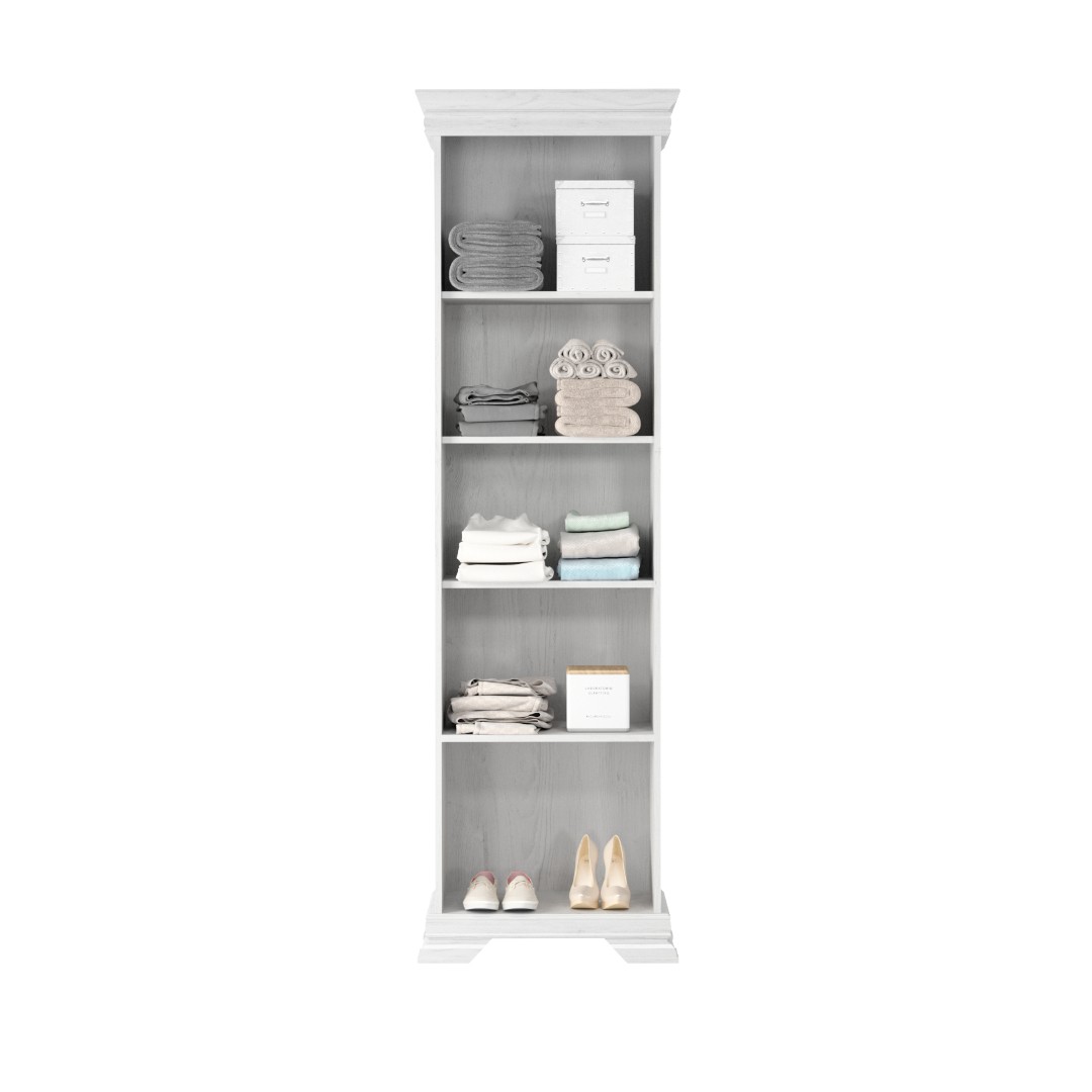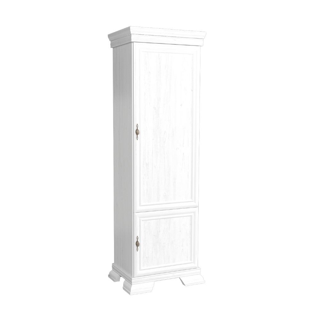 Vnitřek skříně je vybaven policemi, které umožňují snadné a systematické uspořádání šatstva, doplňků nebo jiných potřeb. Skříň disponuje policemi, což usnadňuje třídění sezónních věcí. Elegantní kovové úchytky s patinou a jemné frézování dveří podtrhují rustikální charakter nábytku. Povrch s bohatou texturou dřeva borovice bílá andersen působí příjemným dojmem a snadno se kombinuje s ostatními prvky řady KOBE.