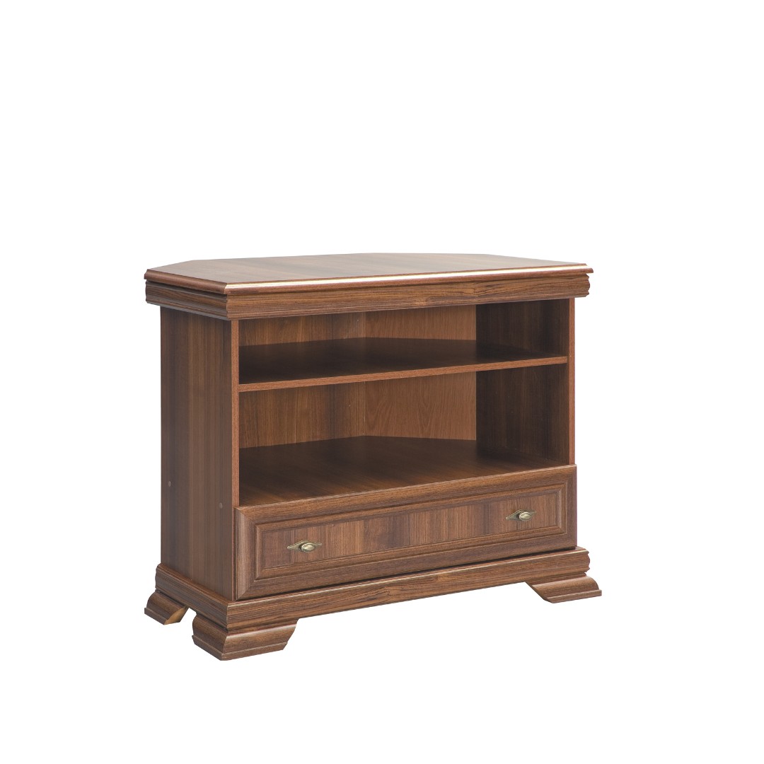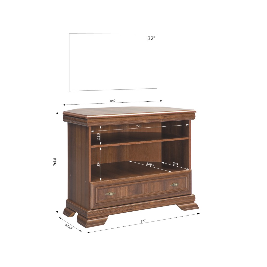 Televizní stolek KOBE KRTN představuje dokonalou volbu pro milovníky klasického stylu. Tento kus nábytku vnáší do interiéru hřejivou atmosféru a eleganci. Na první pohled zaujme svým provedením, jemuž dominují bohatě frézované detaily na dvířkách a výrazné ozdobné lišty v horní i spodní části. Celkový vzhled doplňuje stylové kování v barvě patinovaného zlata, které stolku dodává punc luxusu a podtrhuje jeho tradiční charakter...