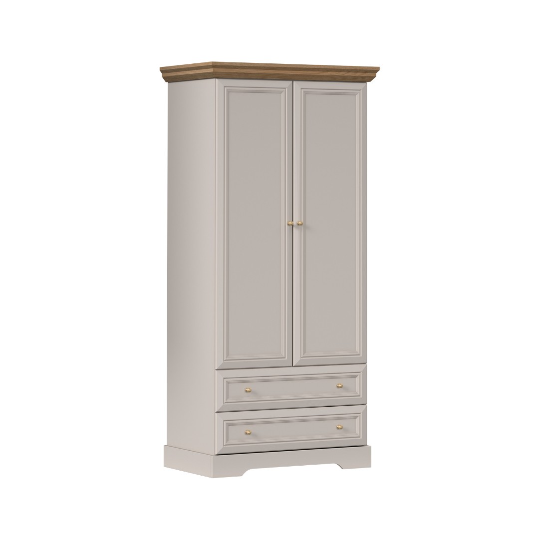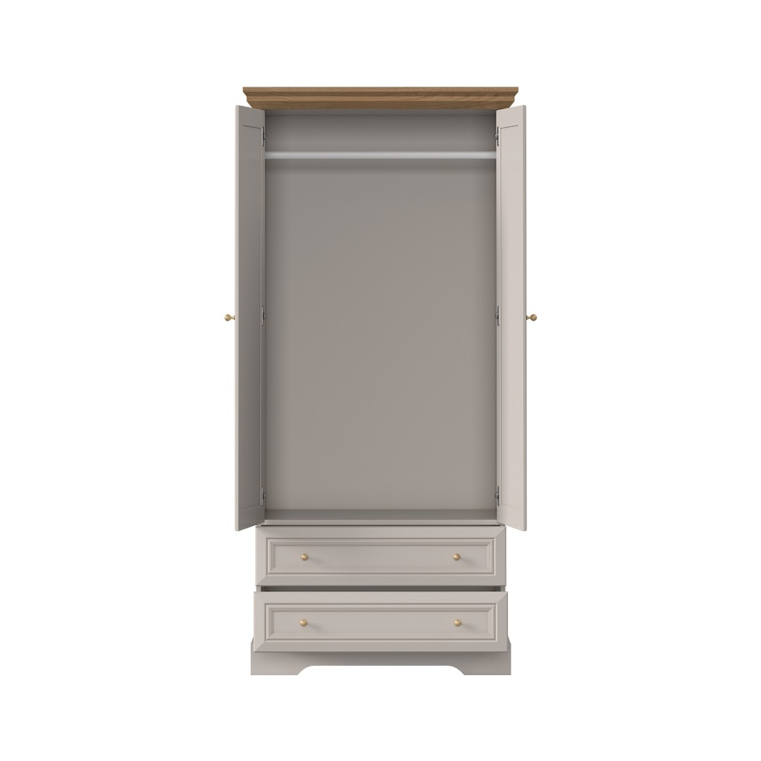 Vnitřek skříně je vybaven šatní tyčí, která umožňují snadné a systematické uspořádání šatstva. Skříň rovněž disponuje ve spodní částí šuplíky, což usnadňuje třídění sezónních věcí. Elegantní kovové úchytky s patinou a jemné frézování dveří podtrhují rustikální charakter nábytku. Barevné provedení je v kombinaci tónů kašmír/dub mauvella.