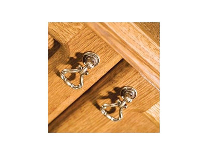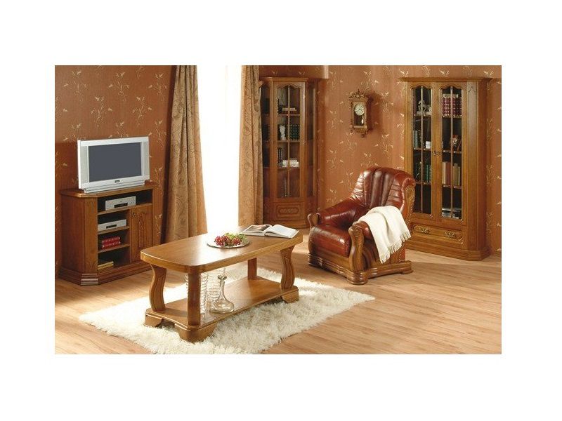 Na levé straně stolku se nacházejí otevřené police vhodné pro uložení DVD přehrávače či jiných drobností. Pravá strana je uzavřená dvířky s ozdobným vyřezávaným dekorem a kovovým úchytem pro jednodušší otevírání.