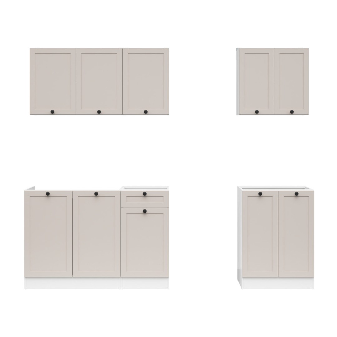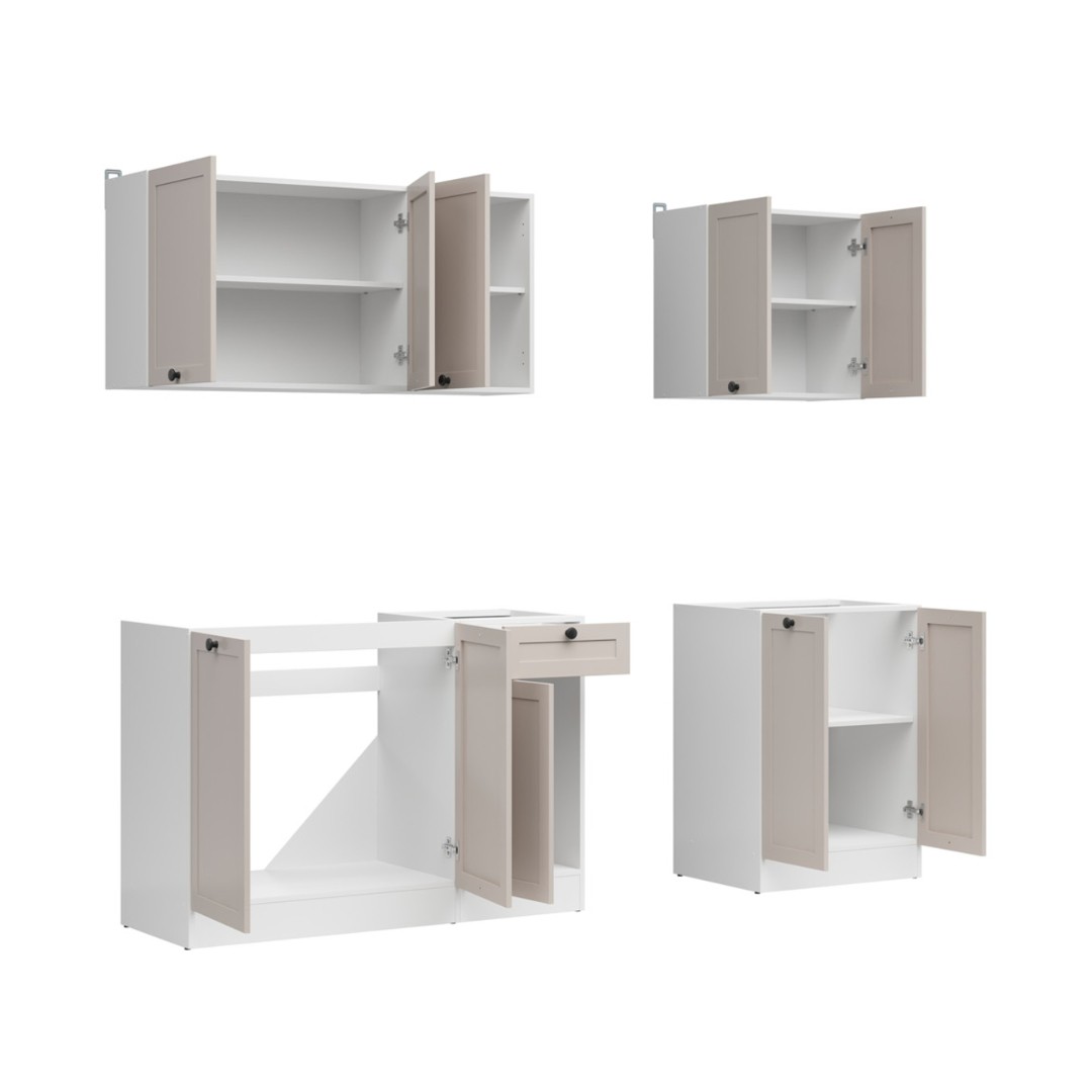 Tato sestava má k dispozici skříňky v kombinaci barev bílá/kašmír. Jednotlivé skříňky můžete ukotvit v libovolném pořadí. V případě, že potřebujete více odkládacího prostoru, pak je možné dokoupit zvlášť další skříňky.