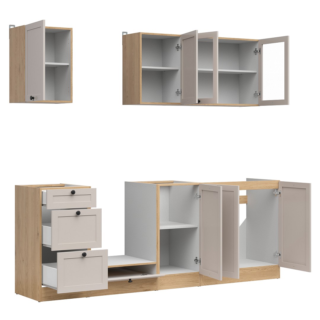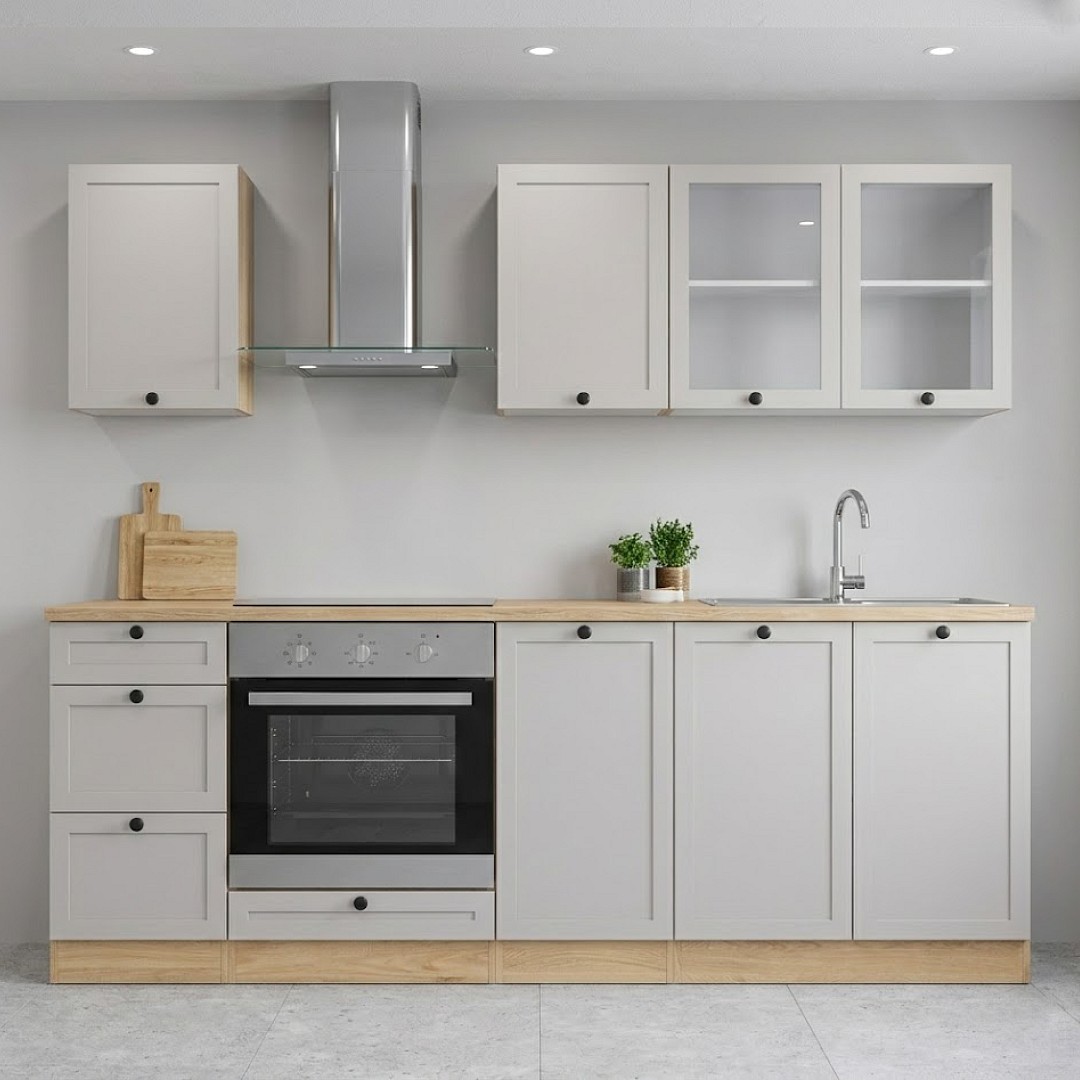 Samostatné skříňky k dokoupení, naleznete po kliknutí zde. Pracovní desky naleznete zde, dřezy zde. Vytvořte si kuchyni snů se sestavou Junona Modul verze 2 v šířce 220 cm. Tento komplet je synonymem pro dokonalou organizaci a styl v kulinářském zázemí. Jelikož sestavu dodáváme bez pracovní desky, získáváte jedinečnou příležitost dotvořit výsledný vzhled povrchem, který přesně ladí s vaším interiérem...