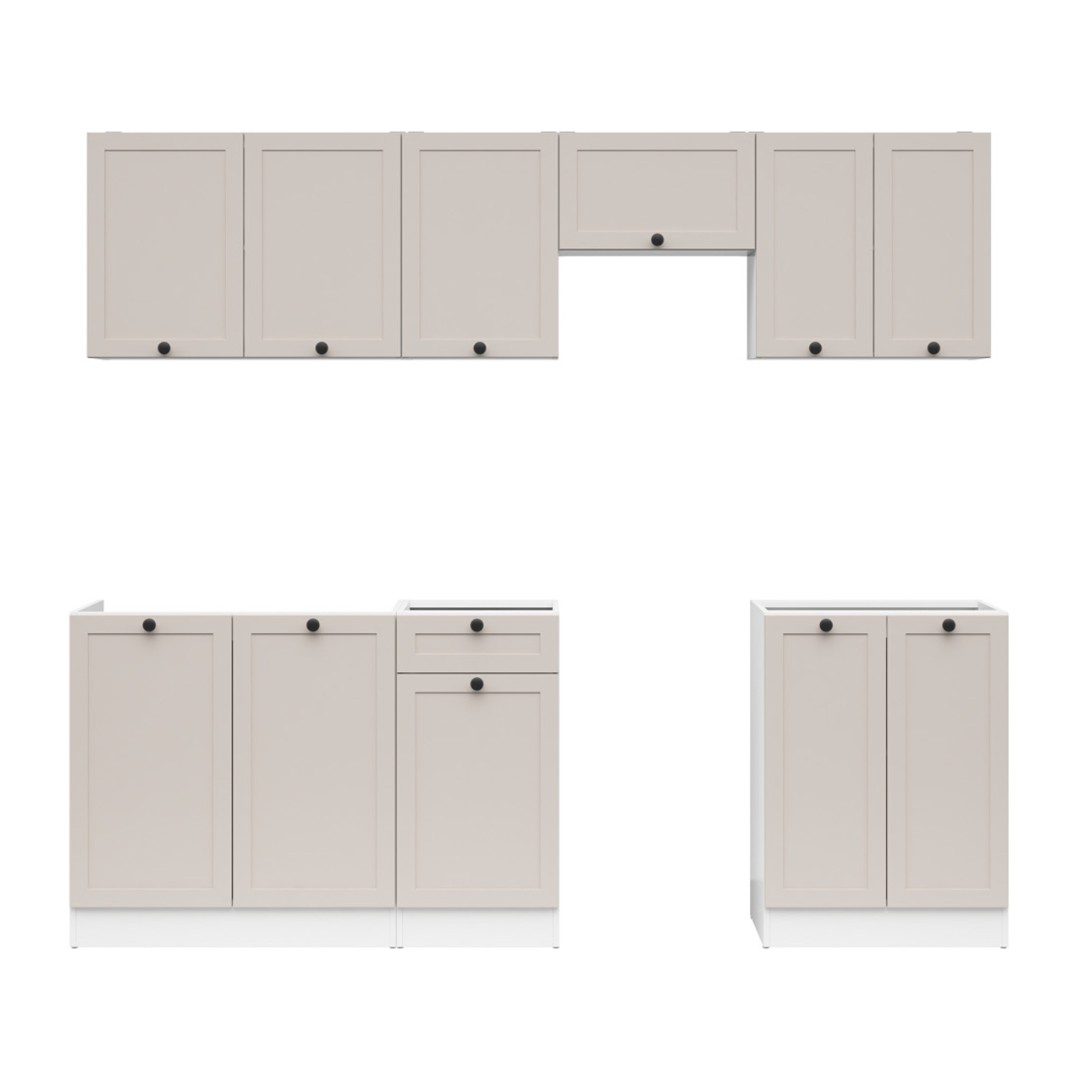Sestava Junona Modul 230 obsahuje čtyři prostorné horní skříňky, ideální pro uložení nádobí, talířů, sklenic a dalších potřeb. Do tří spodních skříněk pak bez problémů uložíte hrnce, pánve nebo odpadkový koš. Kuchyň o šířce 230 cm vám umožní instalaci digestoře, dřezu a volně stojícího sporáku.