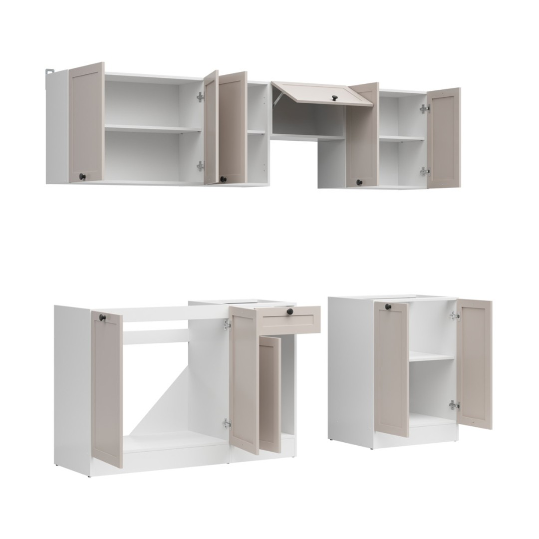 Vzhled sestavy Junona vytváří kombinace bílých korpusů a kašmíru. Podotýkáme, že pracovní desky nejsou součástí této sestavy, ale můžete je snadno zakoupit zvlášť.