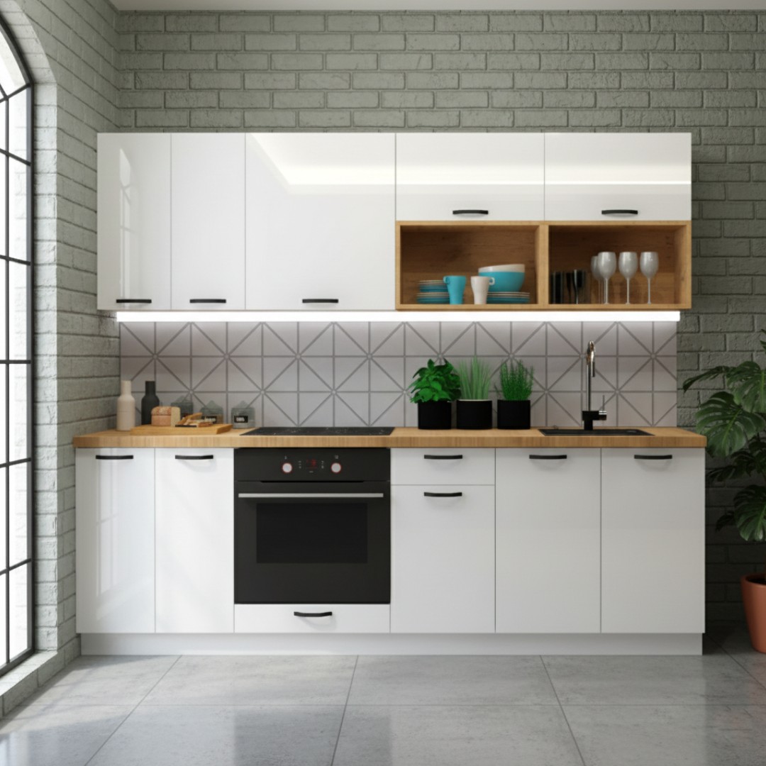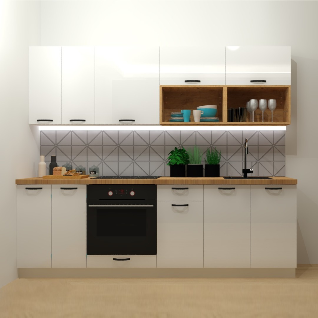 Sestava TOP LINE 240 nabízí dostatek horních i spodních skříněk, což umožňuje praktické, přehledné a efektivní uspořádání kuchyňského vybavení. Barevné provedení kombinuje tóny bílá alpská/bílý lesk, zatímco otevřené police v tónu dub Lancelot dodávají interiéru teplý a přirozený akcent.