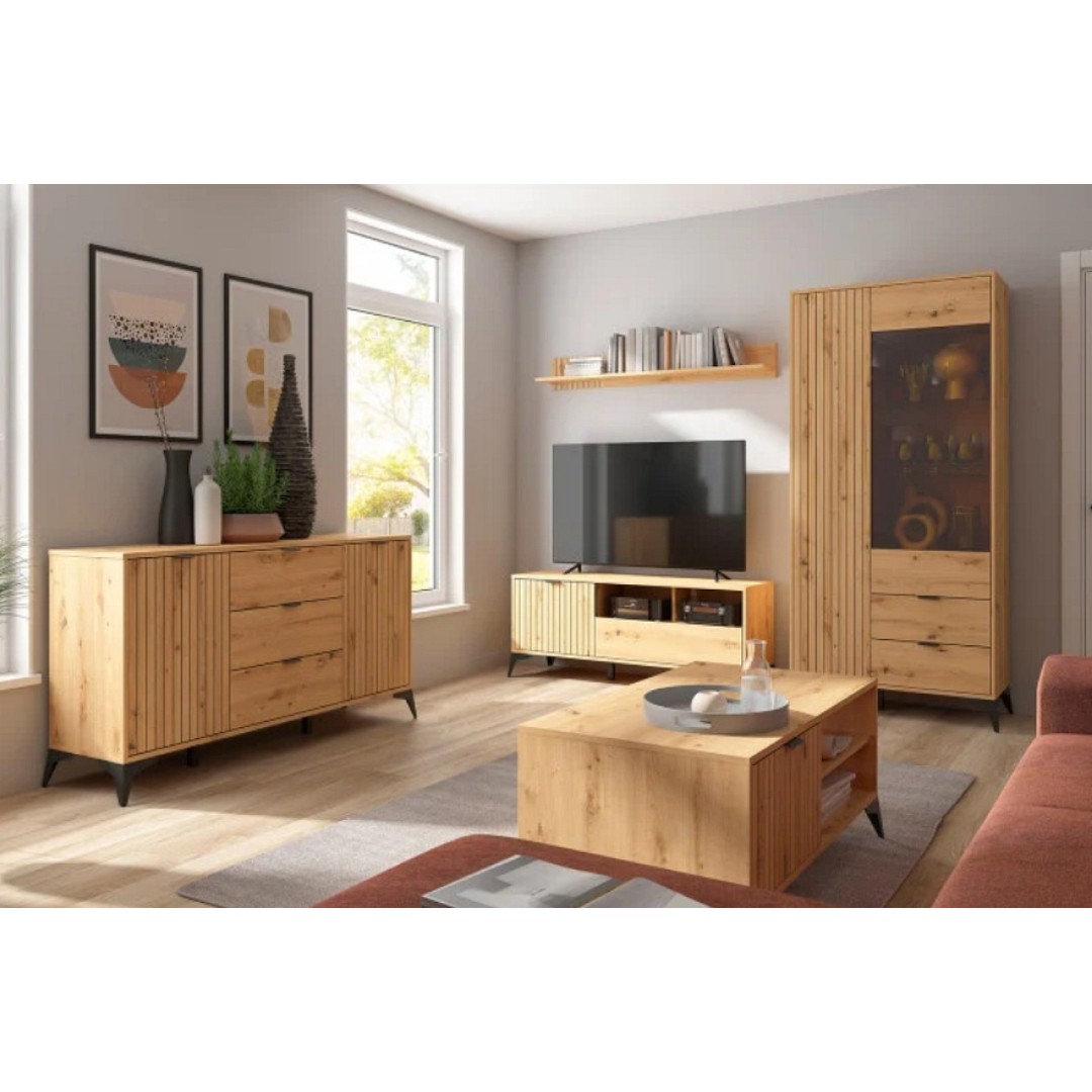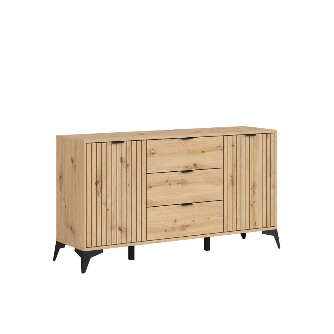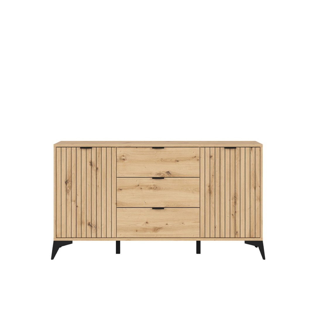 Naše nabídka komody LAMEA KOM2D3S/150 zajišťuje maximální využití prostoru. Můžeme na ní vystavit fotografie a jiné dekorační předměty a to až do 15 kg. Její úložný prostor je rozdělen do tří částí - dvou policových a jedné šuplíkové pro ještě lepší organizaci ukládaných věcí. Šuplíky mají nosnost 4 kg. Dvířka jsou dekorovány rýhováním, které je v dnešní době velice oblíbené.
