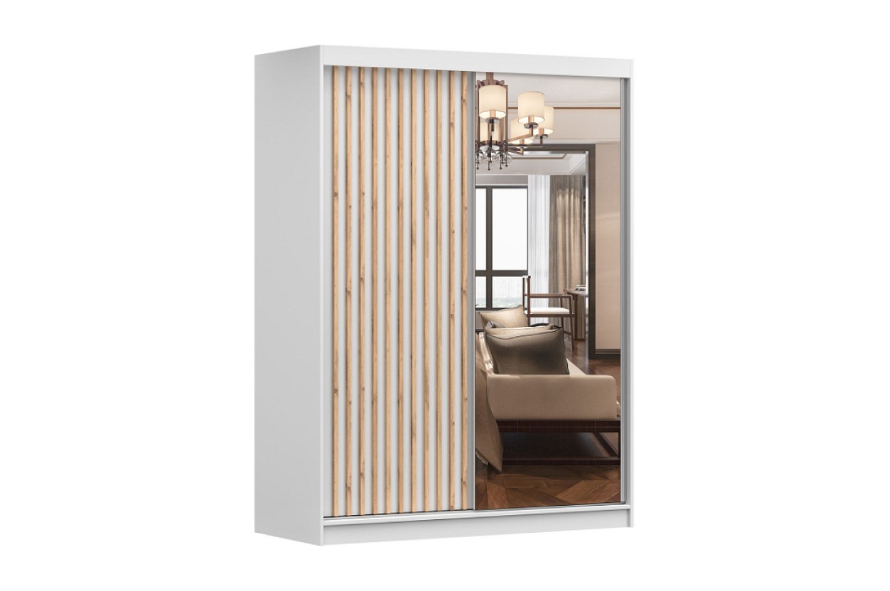 Tato skříň je dostupná v kombinaci barev bílá/bílá/dub/zrcadlo. Dveře jsou posuvné. Vyrobeno z lamina 16mm s ABS hranami. Dveře jsou dekorovány lamelami z MDF, opatřeny efektem dřeva.