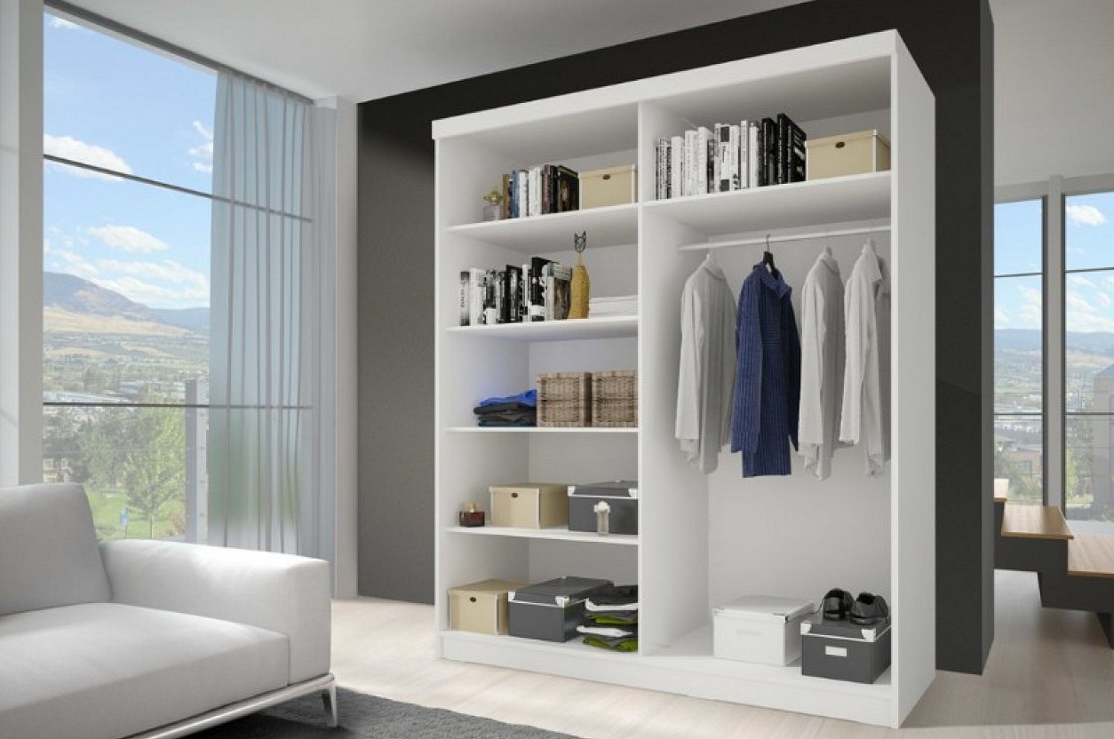 Za posuvnými dveřmi se nachází úložný prostor v podobě šatní tyče a polic. Díky tomu máte skvěle organizovaný šatník.