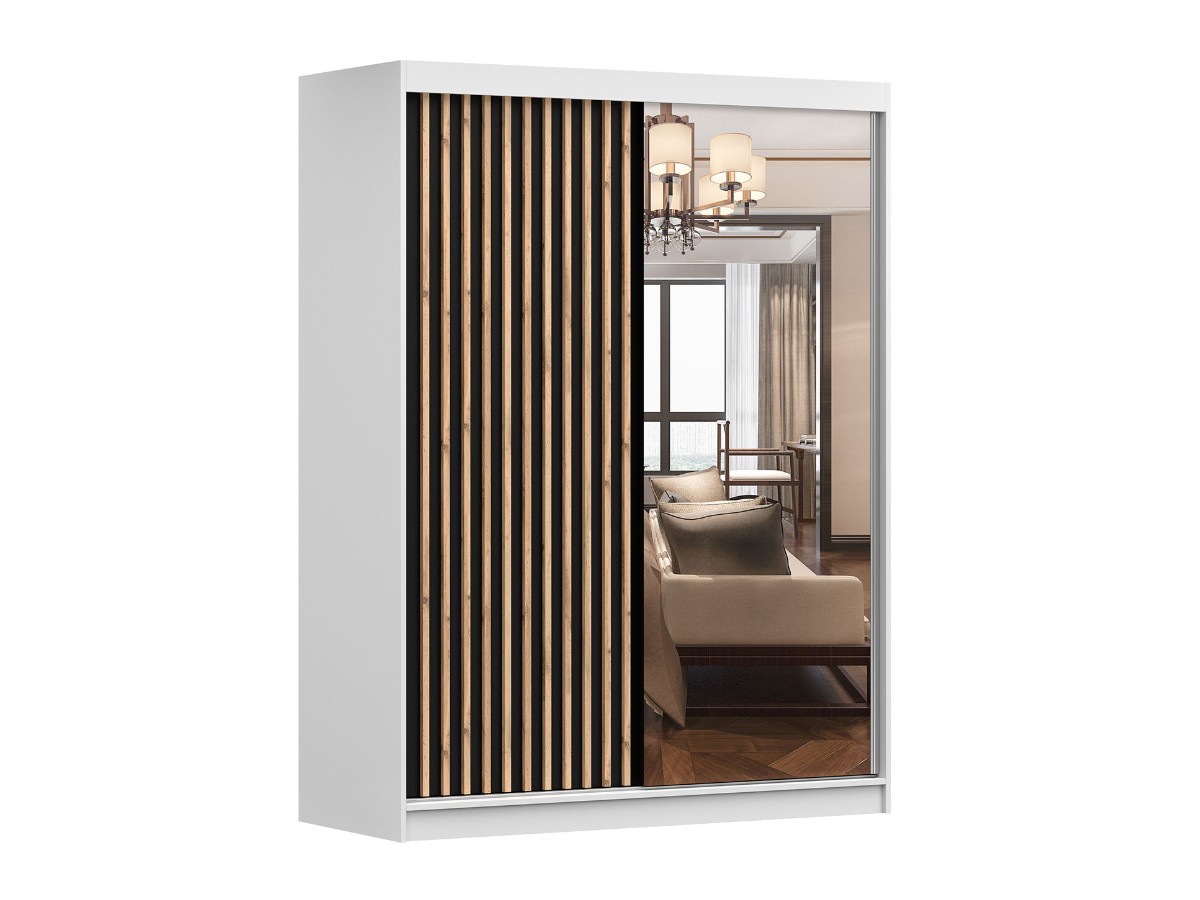 Barevné provedení skříně je v kombinaci tónů bílá/černá/dub/zrcadlo. Materiál - lamino 16 mm + ABS hrany. Zajímavým dekoračním prvkem na skříni jsou ozdobné MDF lamely s efektem dřeva dodávající interiéru styl a eleganci.
