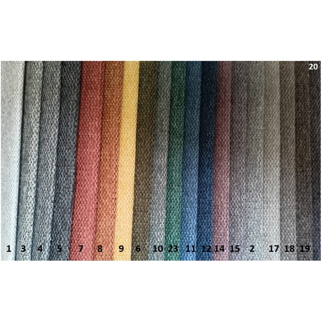 Sestava je očalouněna látkou v tmavě šedé barvě - Matana 05/polštáře sv. šedá Matana 01. Látka má hmotnost 370 g, vysoká otěruvzdornost 57 tis. otáček, odolnost na světlo. V nabídce také další barvy viz barevné varianty.