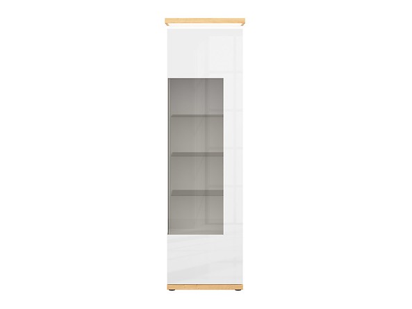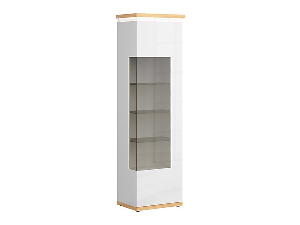 Vitrína je vyrobena z lamina v barevném provedení bílý lesk/dub přírodní. Dvířka jsou opatřeny systémem tichého dovírání a otevírání je na levé straně.