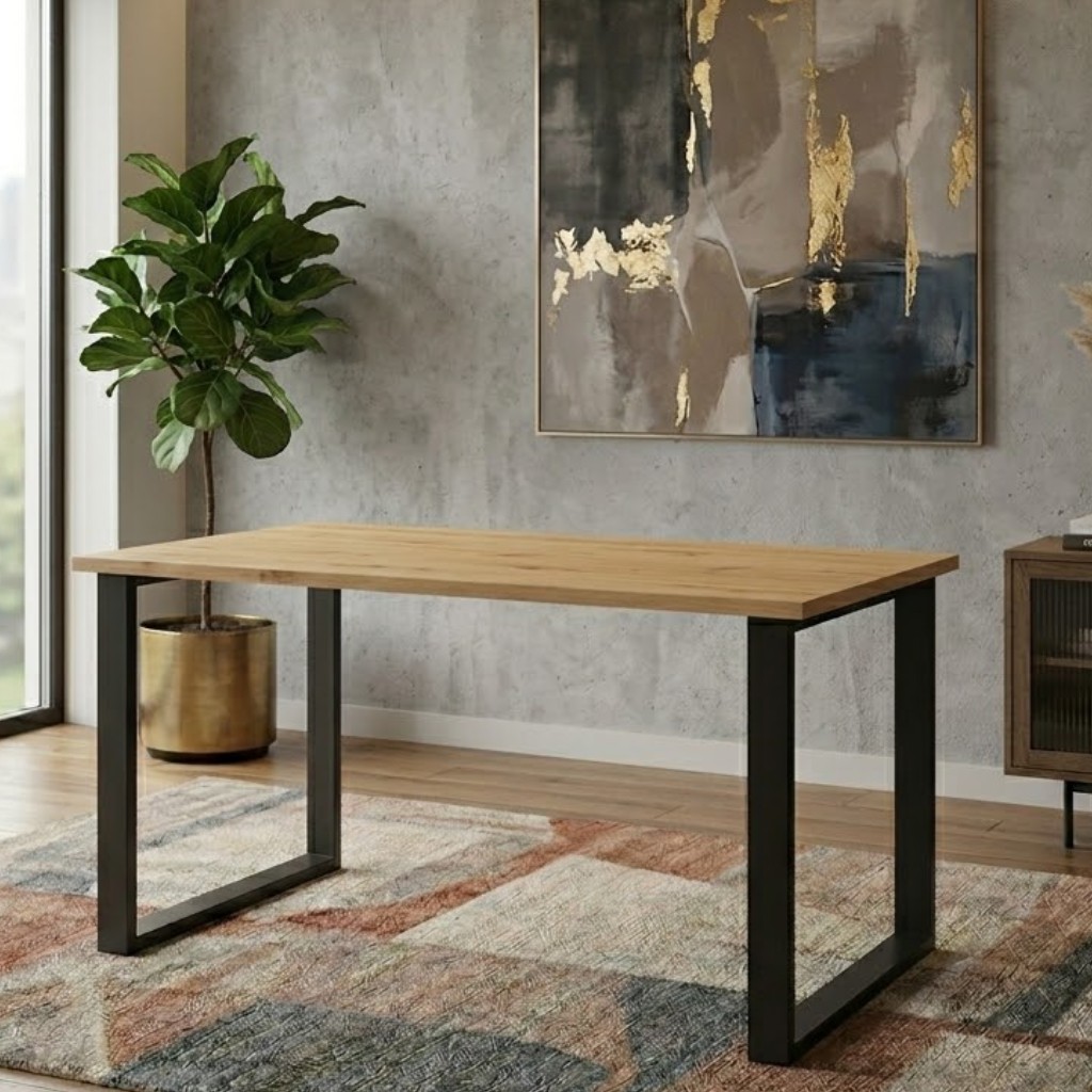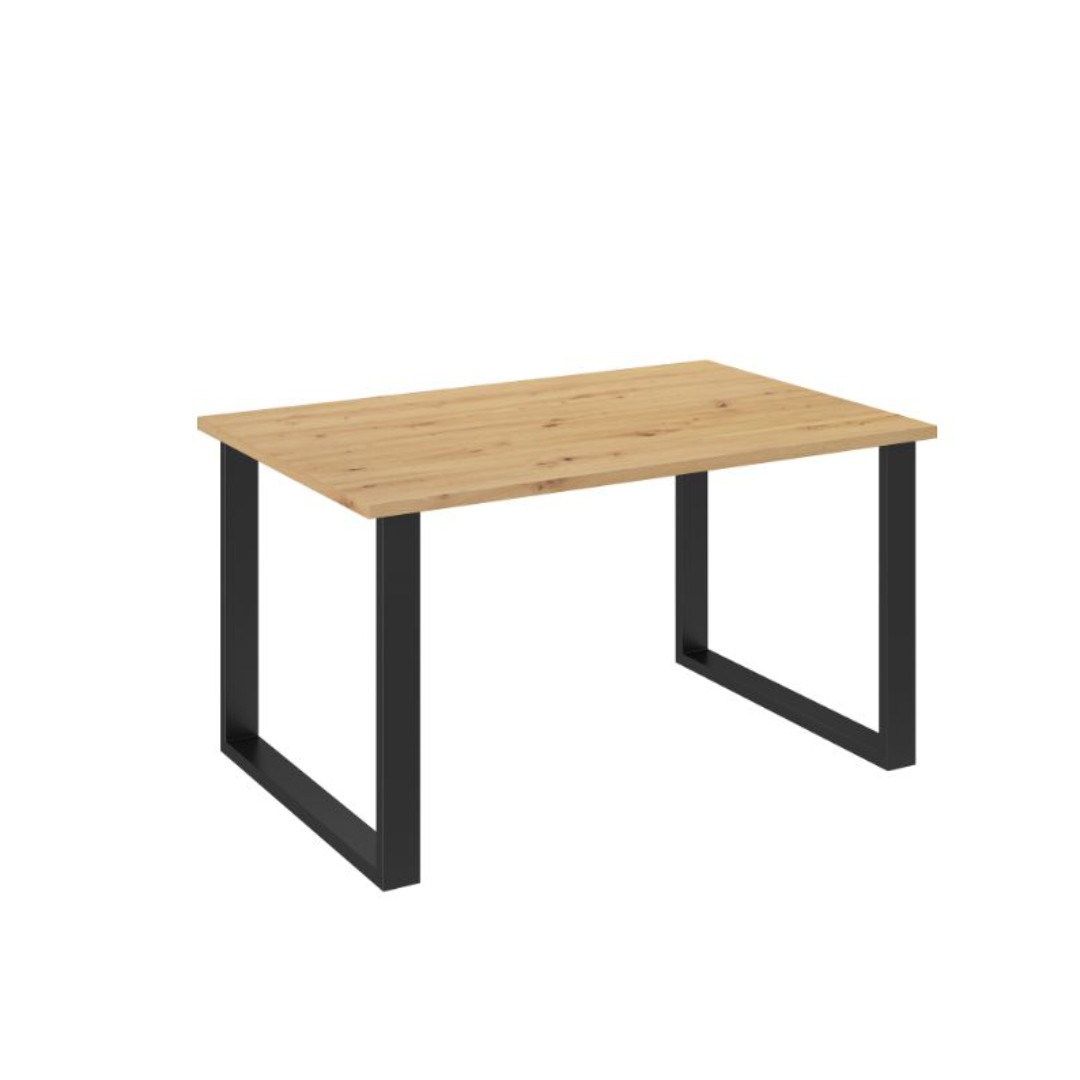 Stůl byl vyroben z lamina o síle 28 mm, jež dodává nábytku robustní vzhled. Barva vrchní desky je v tónu dub artisan. Nohy jsou z černého kovu a vytváří výrazný vizuální dojem. Kovová konstrukce je s práškovým nástřikem, což dodává na odolnosti a životnosti konstrukce. Toto propojení materiálů podtrhuje industriální vzhled nábytku.