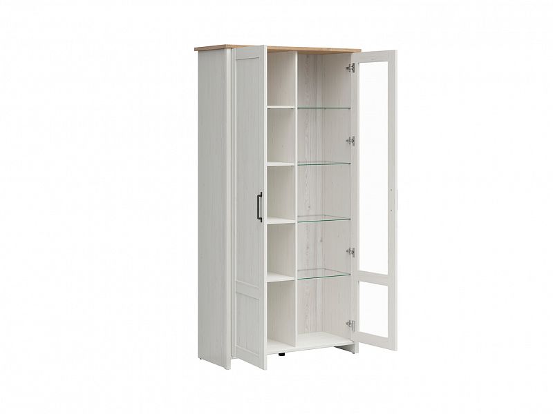 Vitrína je uzavřená dvířky. Pravé dvířka mají prosklený průhled dovnitř. Dále je rozdělena dělící stěnou na dvě části. V obou částech jsou umístěny police, na které si můžete elegantně vystavit dekorační předměty, suvenýry z cest či vaše oblíbené knižní tituly. Délka polic z lamina je 48 cm, skleněné police mají délku 42 cm.