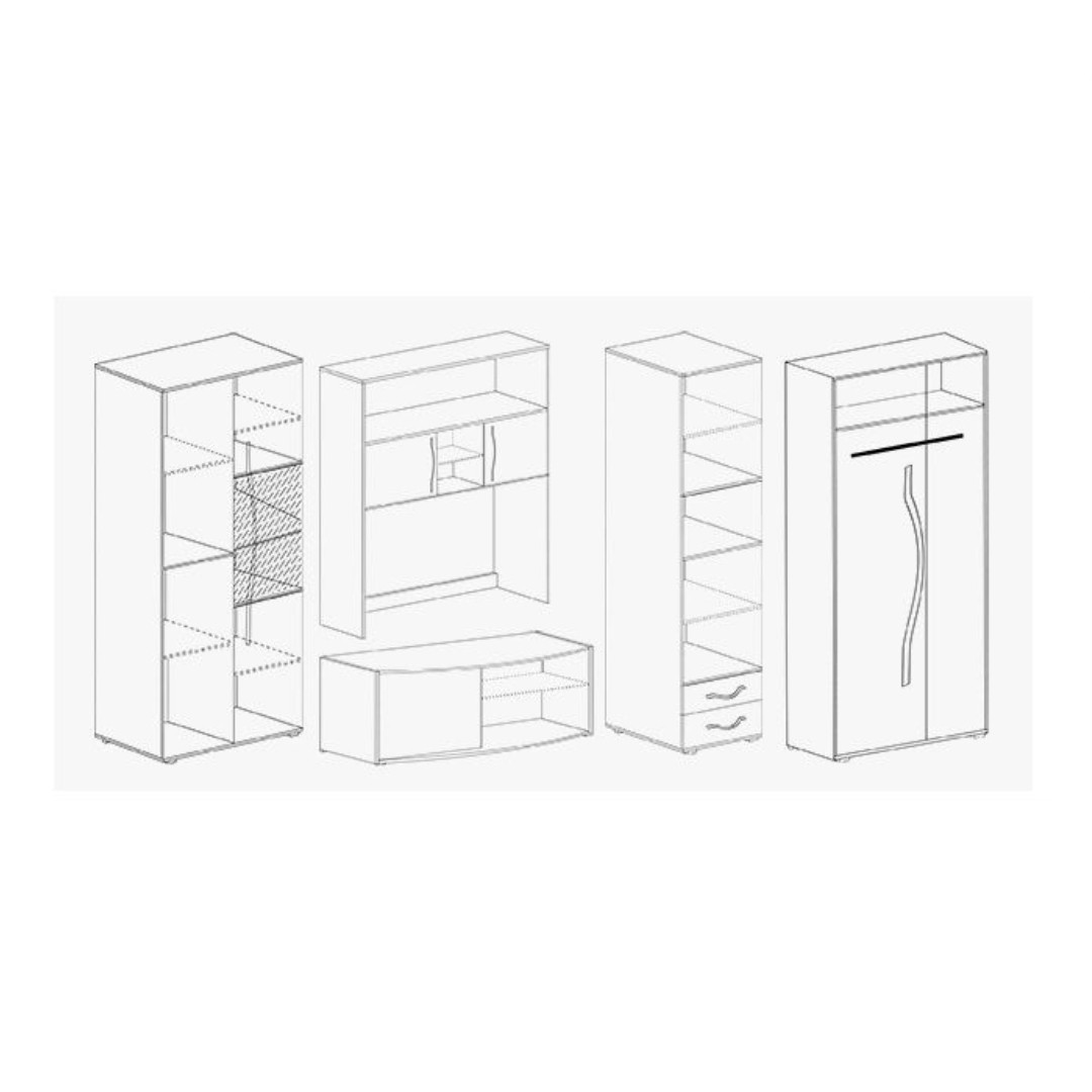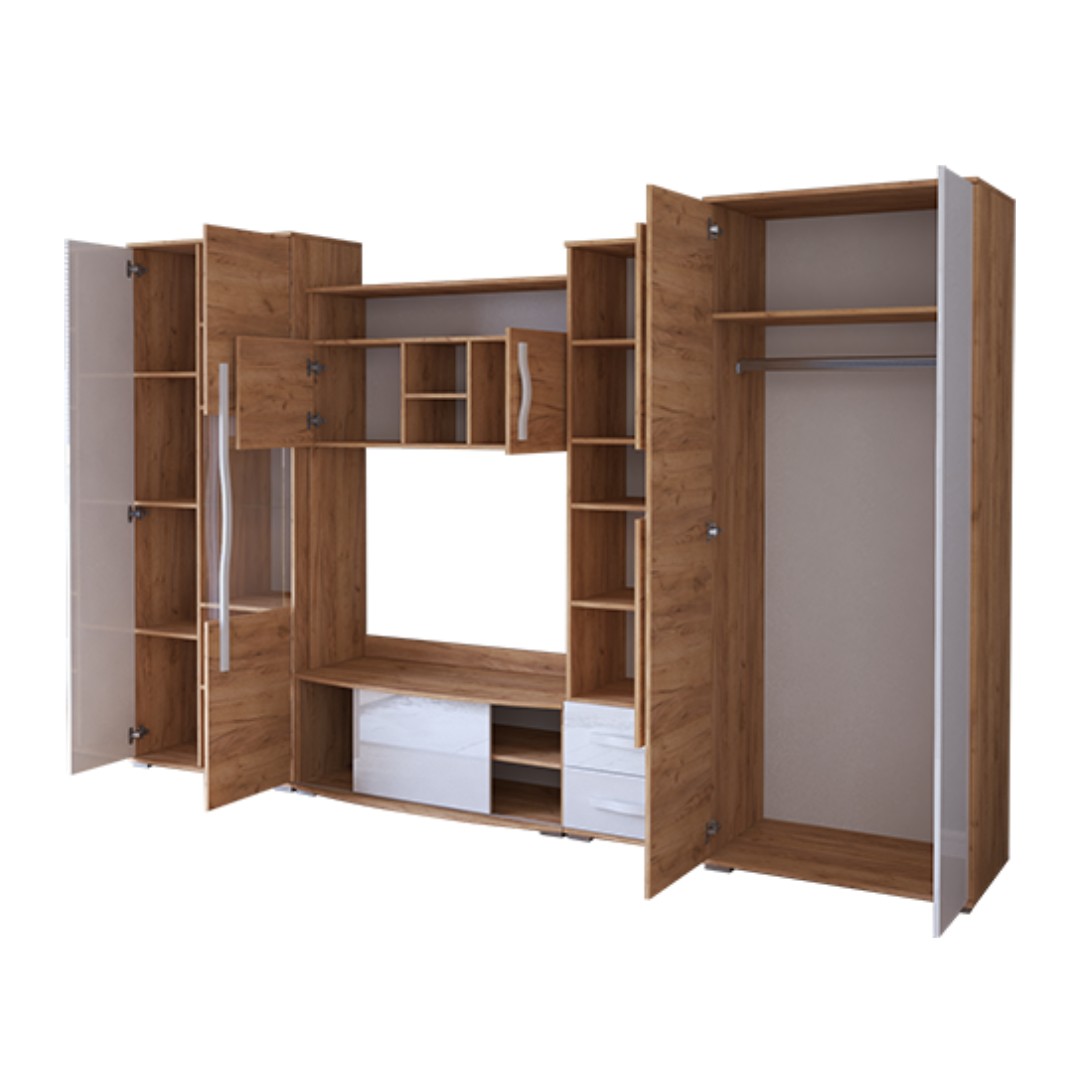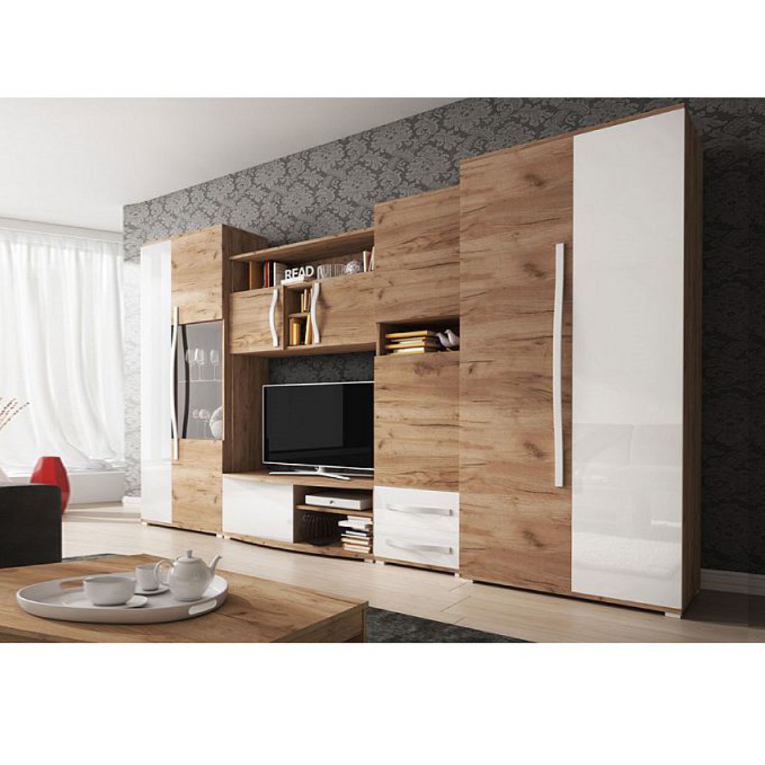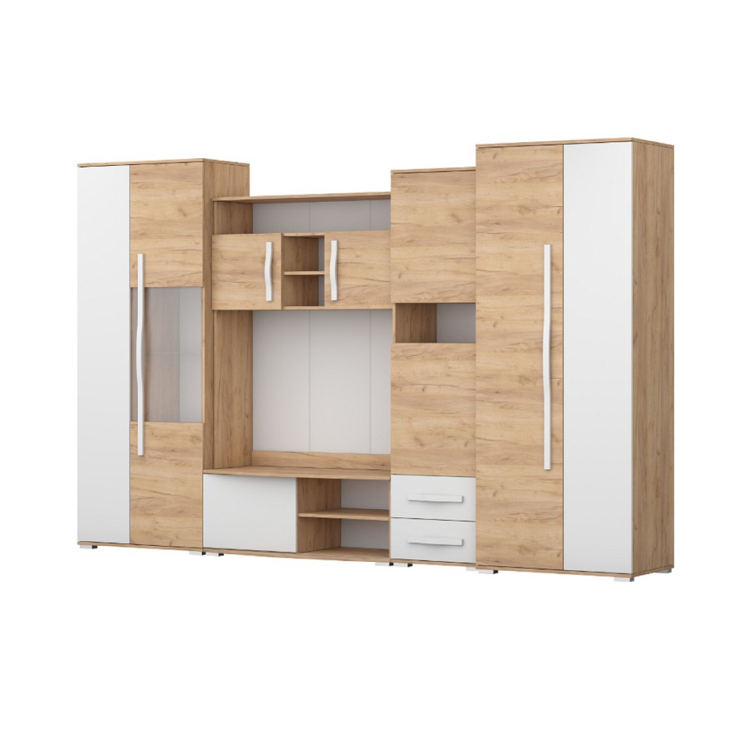 Jednotlivé části tohoto vkusného nábytku jsou vyrobeny z kvalitní dřevotřískové desky o tloušťce 16 mm. Stěna se skládá z TV stolku, police, vitríny, regálu a dvoudveřové skříně. Dodáváme v barevné kombinaci dub craft zlatý a bílý lesk. Zadní sololit má bílou barvu!