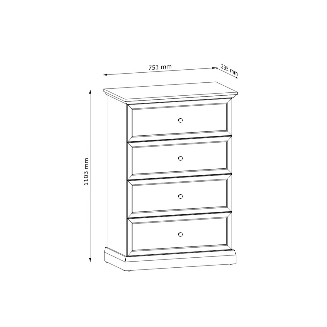 Šuplíková komoda LUCEMBURK K4S spojuje nadčasový design s praktickým uspořádáním. Komoda nabízí prostorné zásuvky, ideální pro uložení oblečení, doplňků či dalších domácích potřeb, přičemž vše zůstává přehledně uspořádané. Kvalitní zpracování, elegantní detaily a stylové kovové úchytky v černé barvě dodávají komodě jedinečný šarm, díky kterému se stane výrazným doplňkem každého interiéru – od ložnice až po obývací pokoj...