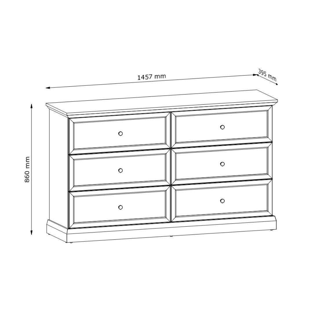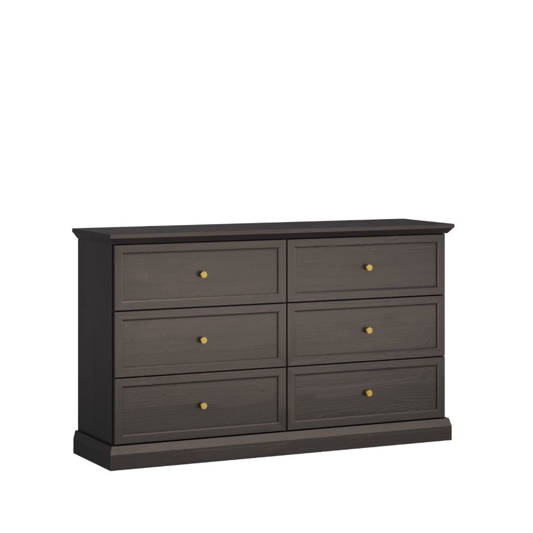 Praktická komoda LUCEMBURK K6S se šesti prostornými zásuvkami upevněnými na sokly. Má kovové úchyty ve zlaté barvě a prostornou vrchní deskou. Dekor v grafitové barvě s výrazným dekorem dřeva. Dokonale propojuje přirozenou krásu materiálu. Estetika kolekce LUCEMBURK umožňuje volně kombinovat klasický a moderní styl...